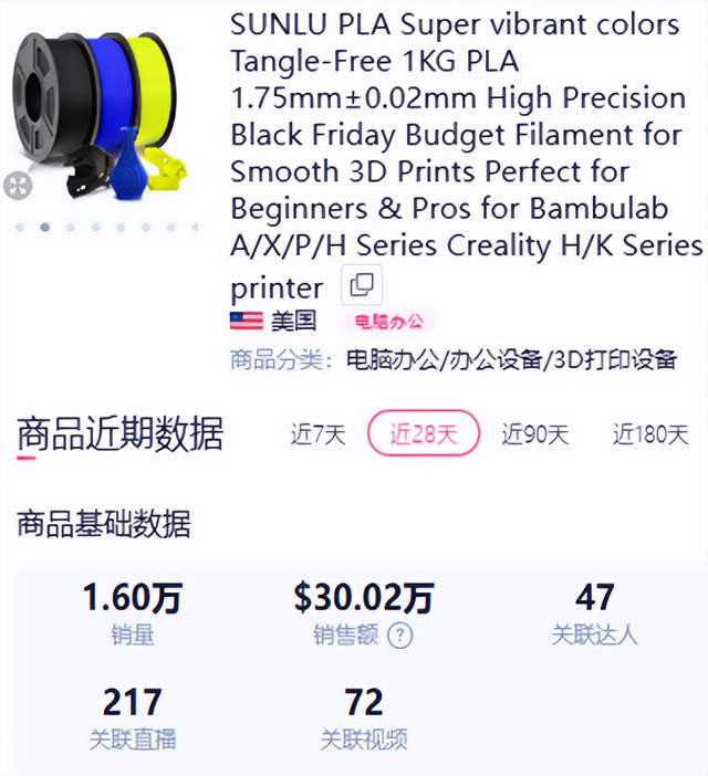 近期,TikTok美区的电脑办公类目中,就有一款用于3D打印的PLA(聚乳酸)线材产品爆单。后台数据显示,其在近30天时间里售出了1.6万件,销售额达到30万美元(约合人民币213万元)。