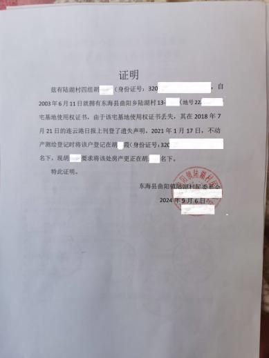 同年,胡先生父亲发现本人房产证及妻子张某土地使用证遗失,随即在《连云港日报》刊登遗失声明,并向村委会报备。