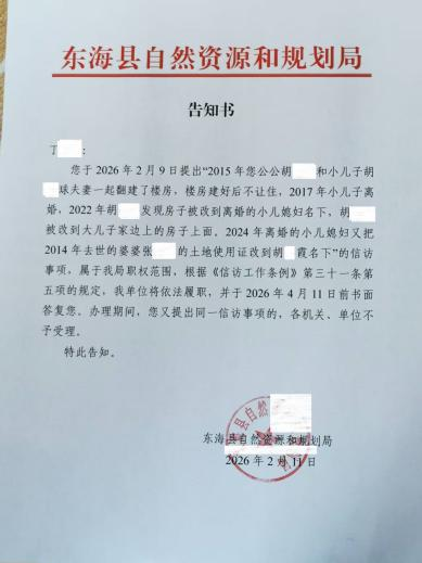 在多方沟通中,部分基层干部的答复进一步加剧当事人不满。胡先生2012年搭建的简易房,按当时农村习惯未办理审批手续,后被纳入确权范围并登记至胡先生父亲名下,2024年相关部门仍通知胡先生父亲补签字,该确权未经胡先生书面确认即完成审核流程,当事人认为审批程序不规范。胡先生父亲于2025年12月21去世,其已挂失的房产证,在原有房屋已翻建、权属存在争议的情况下,仍于疫情期间被注销并变更至胡某霞名下,存在人为操作空间。