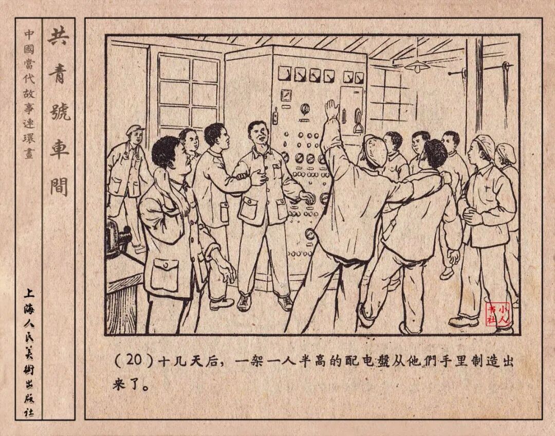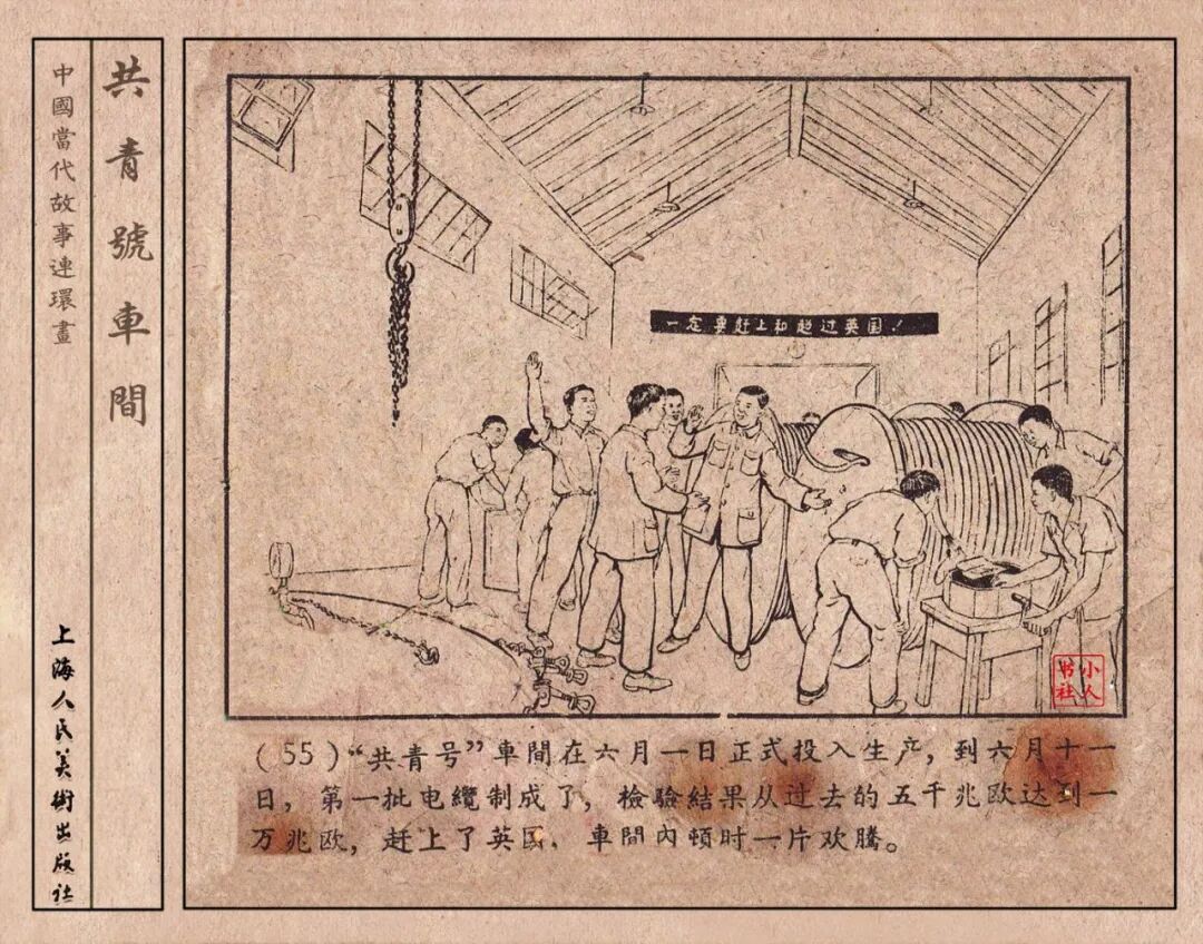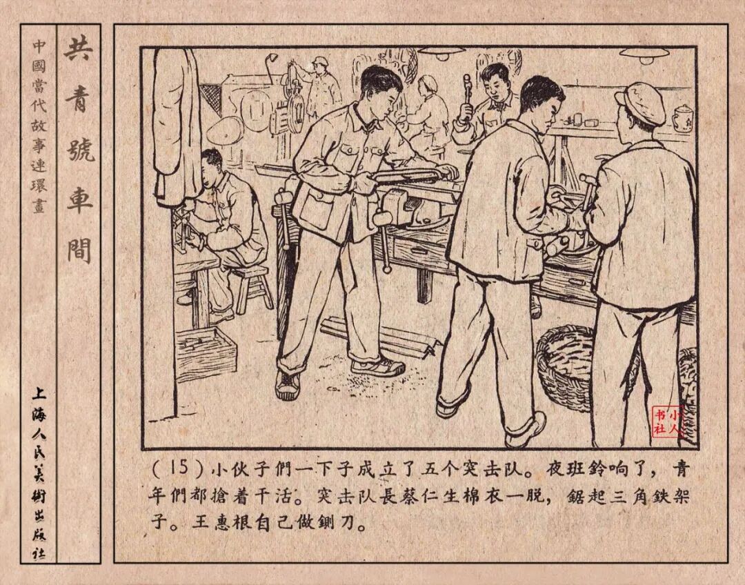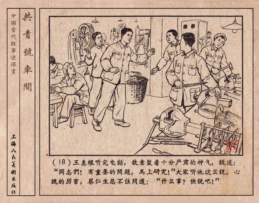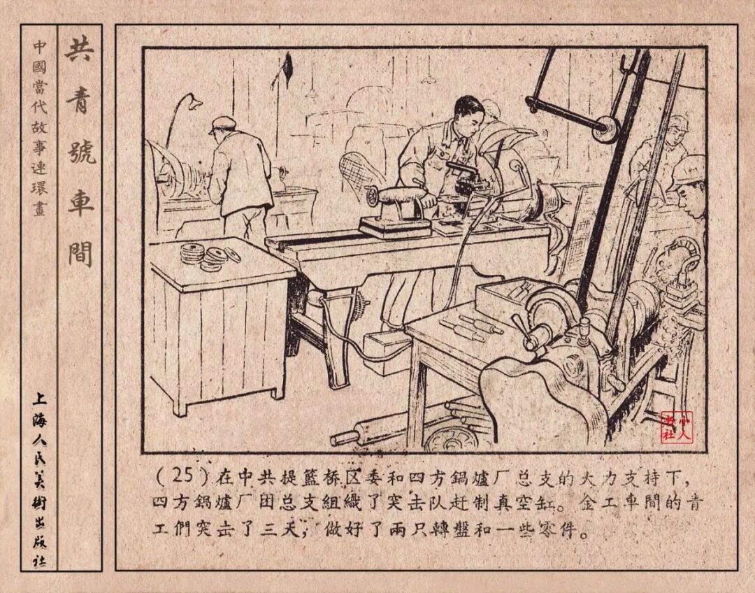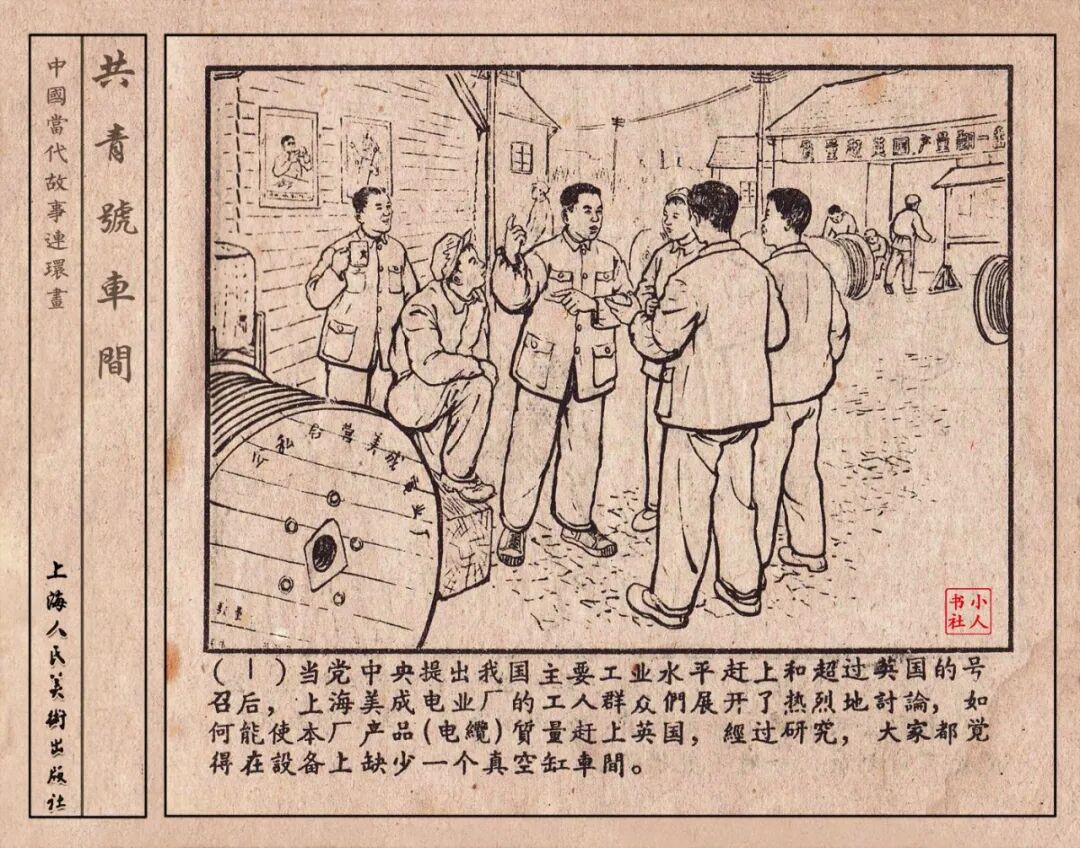 《“共青号”车间》连环画是由何进绘画。故事讲述在总路线的光辉照耀下,各个生产战线上都在大跃进,出现了许多生动的、激动人心的事例。生产力大大的解放了。人与人的关系起了深刻的变化。人们正在经历着“一天等于二十年”的伟大时代。画册不但画出了人们正在百倍雄心地建設伟大的祖国的面貌;也说明了只有在党的领导下,人们才能朝气蓬勃地乘风破浪向社会主义迈进!这本书是其中的一本。内容是讲上海美成电业厂的共青团员和青工们,为了赶上英国,在其他兄弟厂的协助下,建造了一个真空缸间,由团中央命名为“共青号”车间。(本书根据“萌芽”1958年第12期哈宽贵原著改)