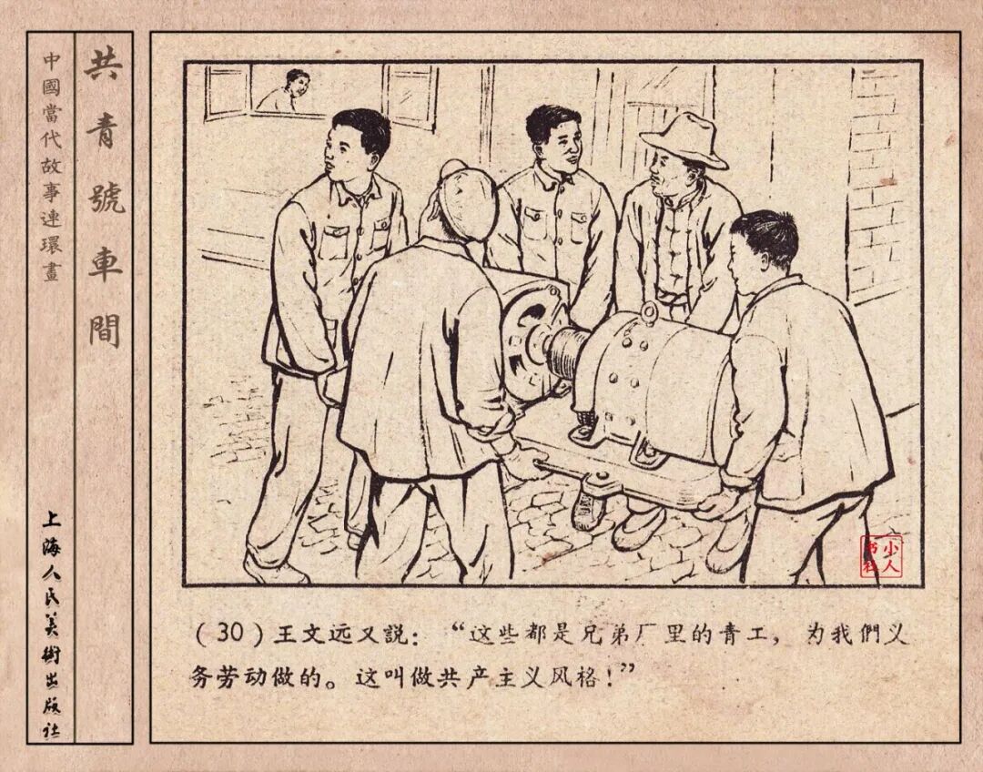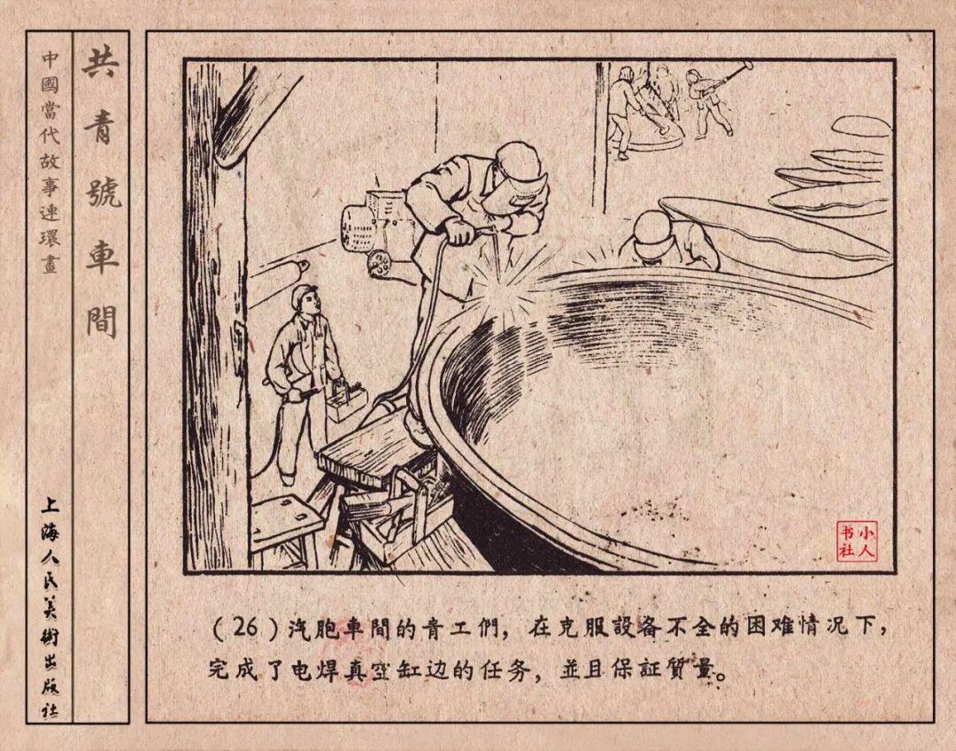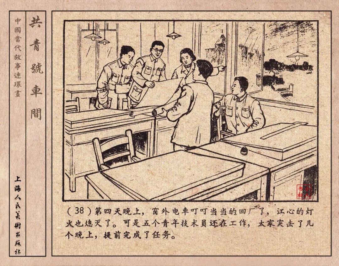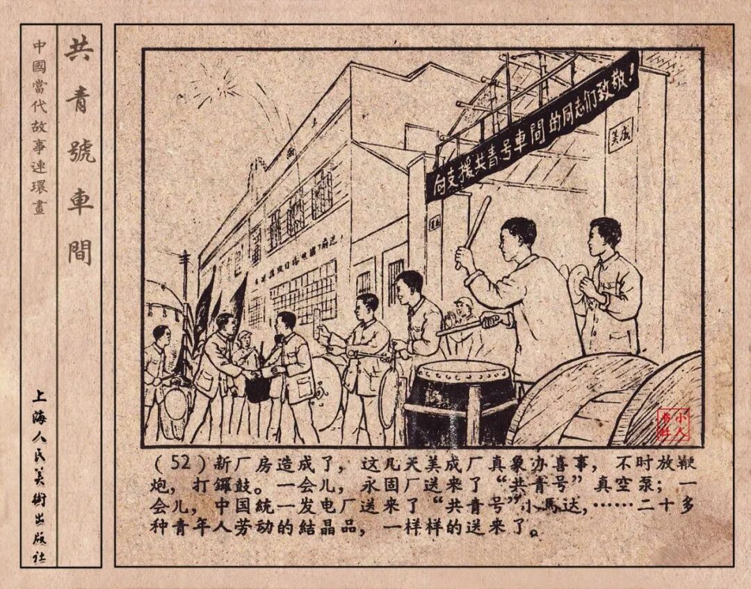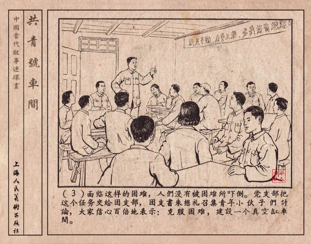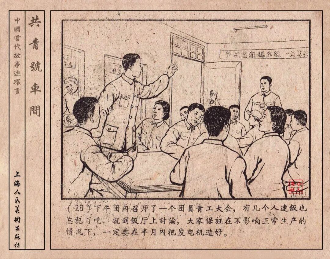 《“共青号”车间》连环画是由何进绘画。故事讲述在总路线的光辉照耀下,各个生产战线上都在大跃进,出现了许多生动的、激动人心的事例。生产力大大的解放了。人与人的关系起了深刻的变化。人们正在经历着“一天等于二十年”的伟大时代。画册不但画出了人们正在百倍雄心地建設伟大的祖国的面貌;也说明了只有在党的领导下,人们才能朝气蓬勃地乘风破浪向社会主义迈进!这本书是其中的一本。内容是讲上海美成电业厂的共青团员和青工们,为了赶上英国,在其他兄弟厂的协助下,建造了一个真空缸间,由团中央命名为“共青号”车间。(本书根据“萌芽”1958年第12期哈宽贵原著改)