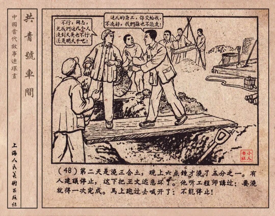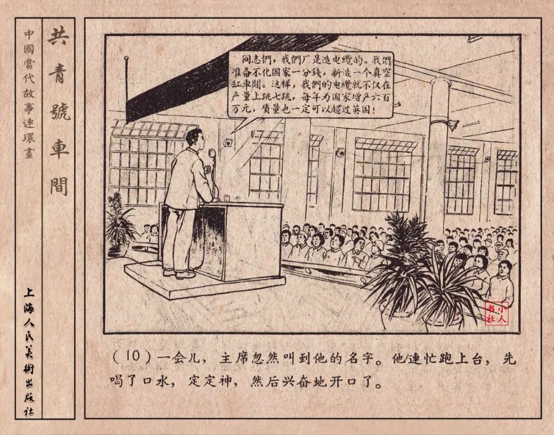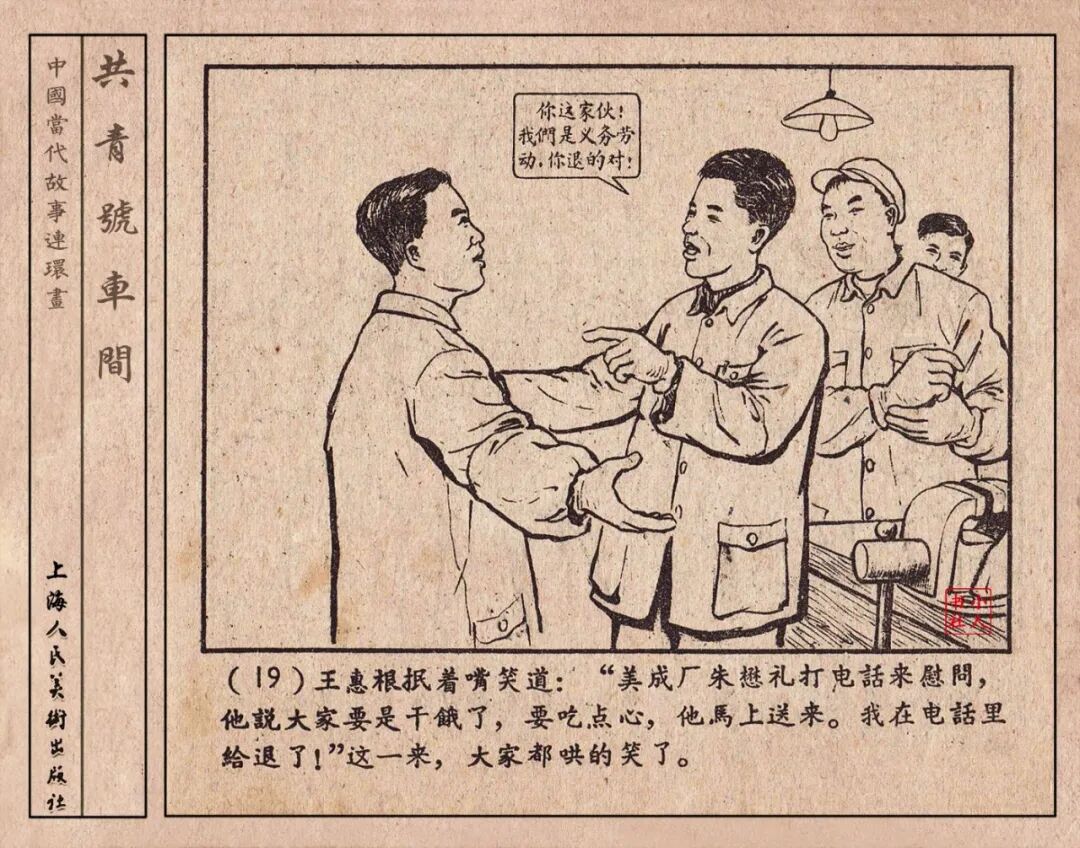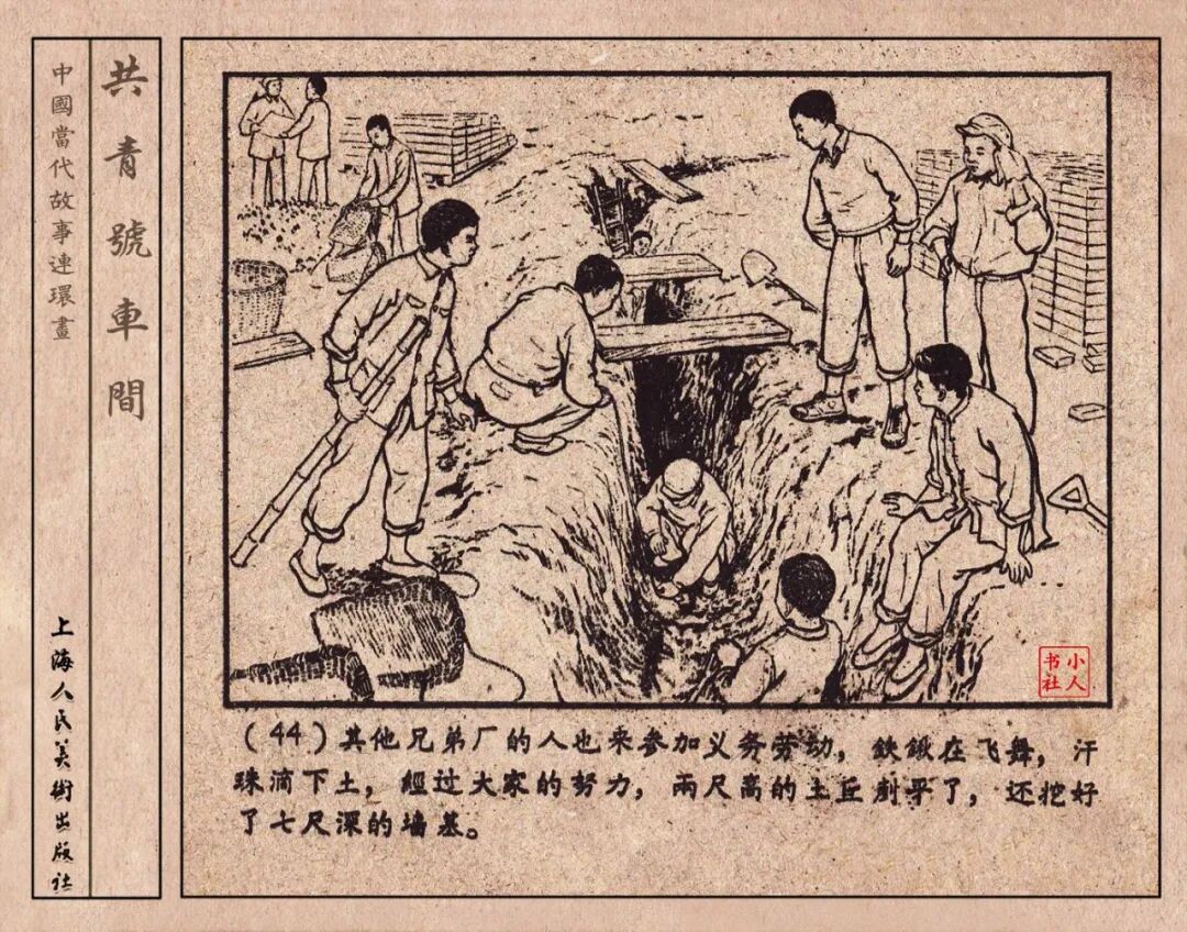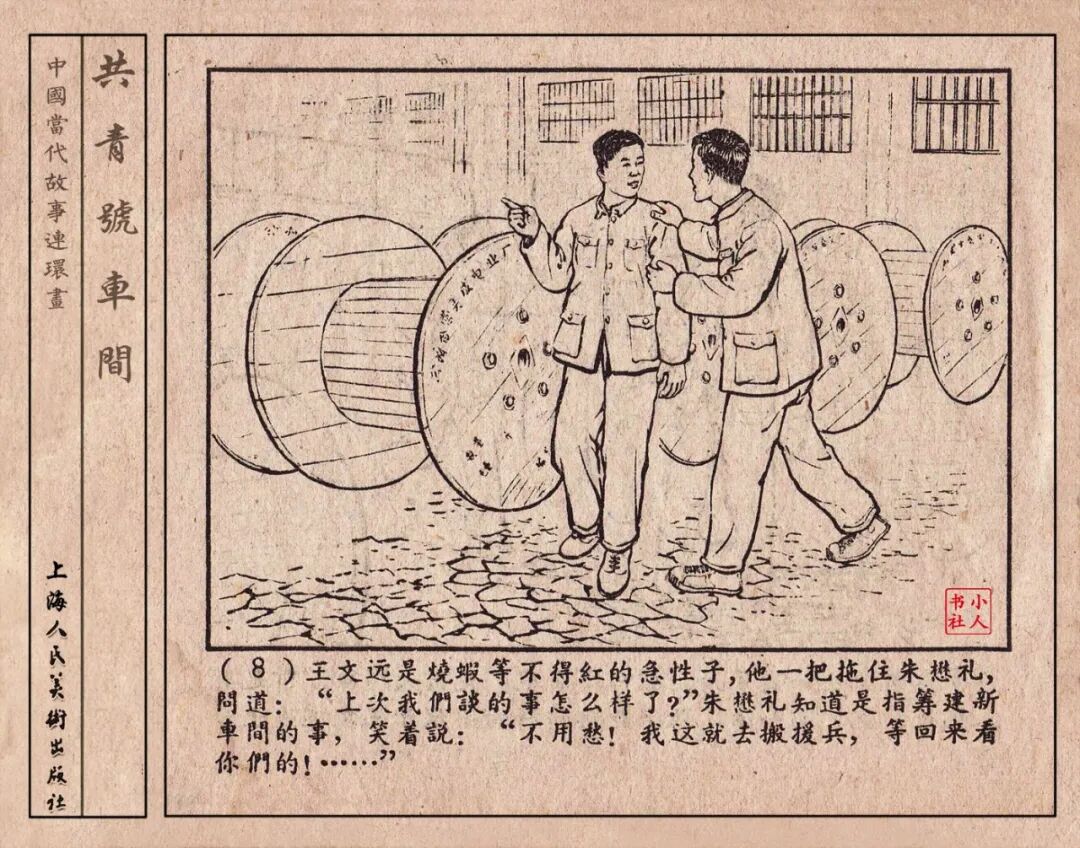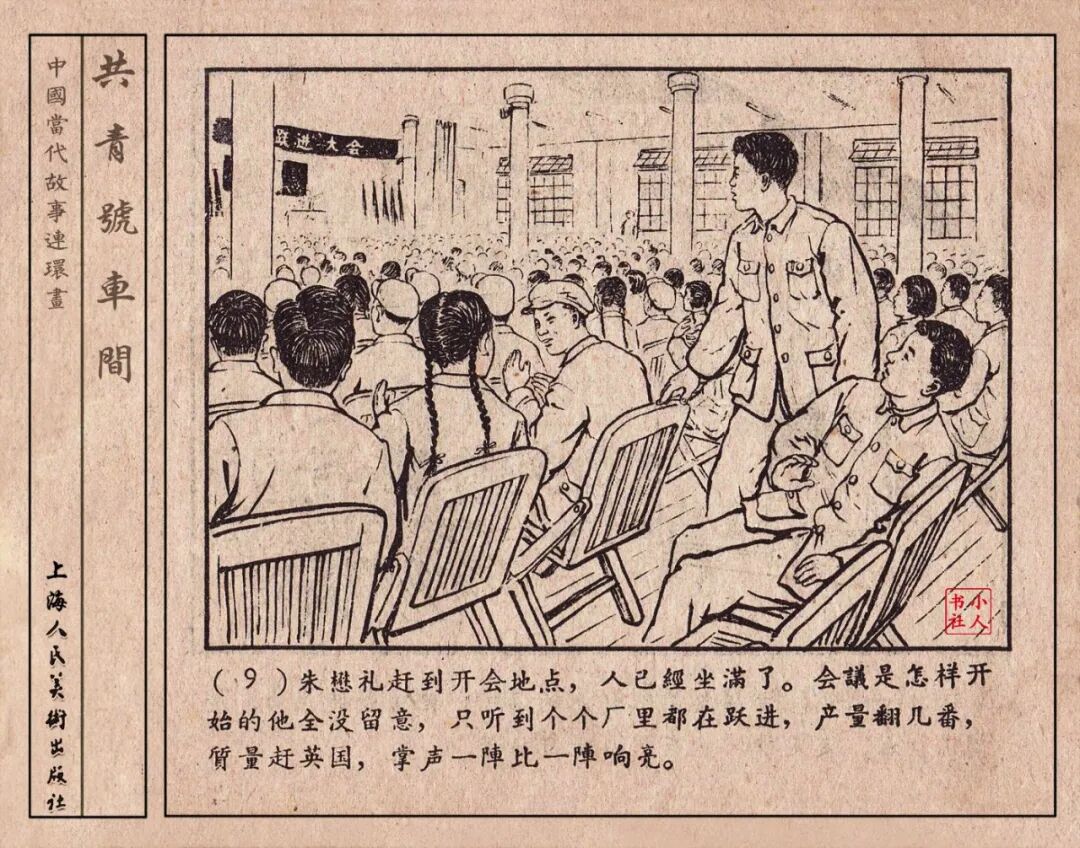 《“共青号”车间》连环画是由何进绘画。故事讲述在总路线的光辉照耀下,各个生产战线上都在大跃进,出现了许多生动的、激动人心的事例。生产力大大的解放了。人与人的关系起了深刻的变化。人们正在经历着“一天等于二十年”的伟大时代。画册不但画出了人们正在百倍雄心地建設伟大的祖国的面貌;也说明了只有在党的领导下,人们才能朝气蓬勃地乘风破浪向社会主义迈进!这本书是其中的一本。内容是讲上海美成电业厂的共青团员和青工们,为了赶上英国,在其他兄弟厂的协助下,建造了一个真空缸间,由团中央命名为“共青号”车间。(本书根据“萌芽”1958年第12期哈宽贵原著改)