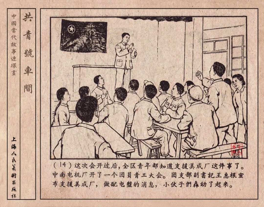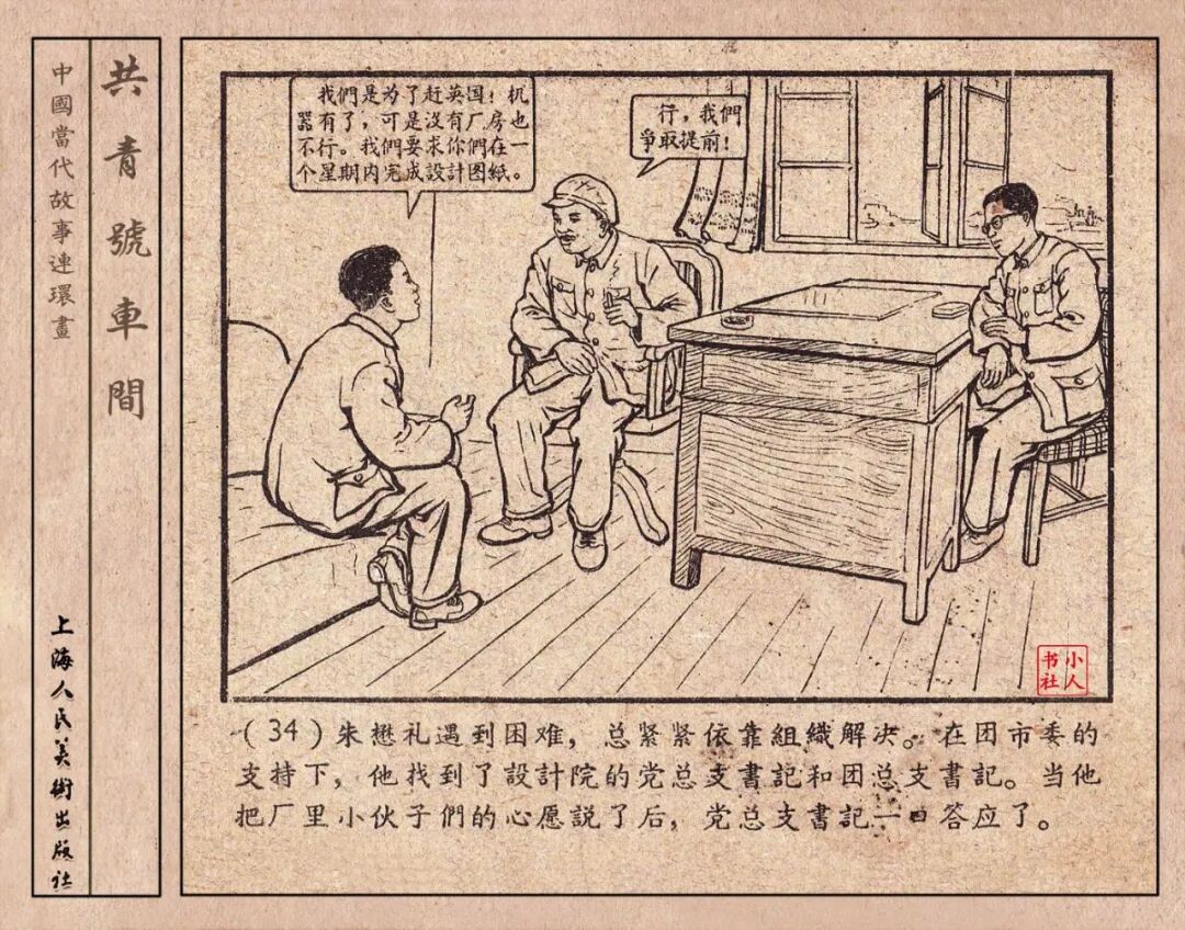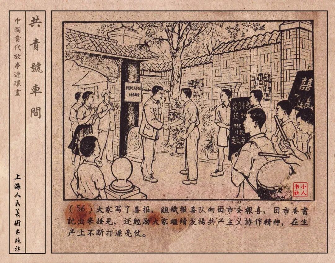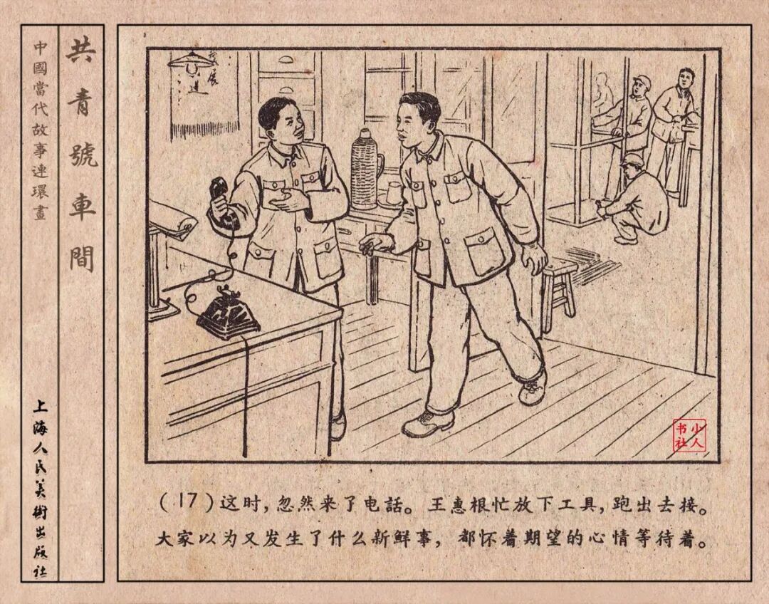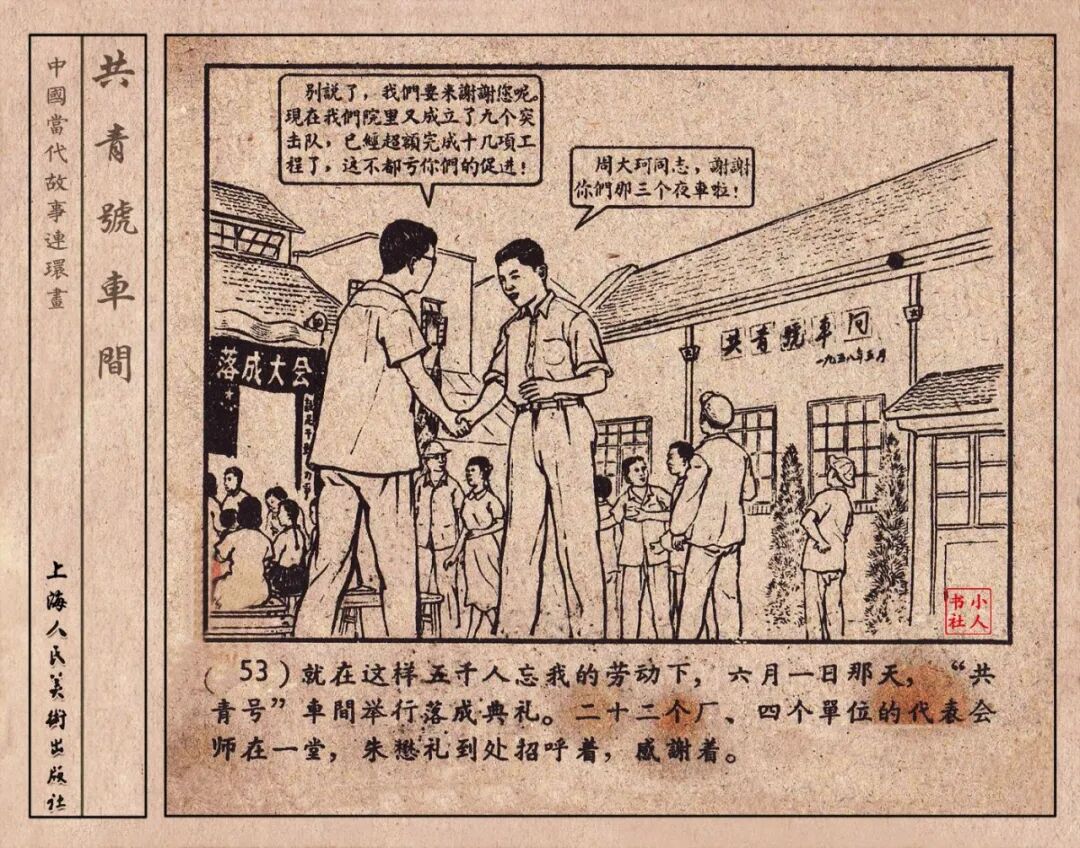 《“共青号”车间》连环画是由何进绘画。故事讲述在总路线的光辉照耀下,各个生产战线上都在大跃进,出现了许多生动的、激动人心的事例。生产力大大的解放了。人与人的关系起了深刻的变化。人们正在经历着“一天等于二十年”的伟大时代。画册不但画出了人们正在百倍雄心地建設伟大的祖国的面貌;也说明了只有在党的领导下,人们才能朝气蓬勃地乘风破浪向社会主义迈进!这本书是其中的一本。内容是讲上海美成电业厂的共青团员和青工们,为了赶上英国,在其他兄弟厂的协助下,建造了一个真空缸间,由团中央命名为“共青号”车间。(本书根据“萌芽”1958年第12期哈宽贵原著改)