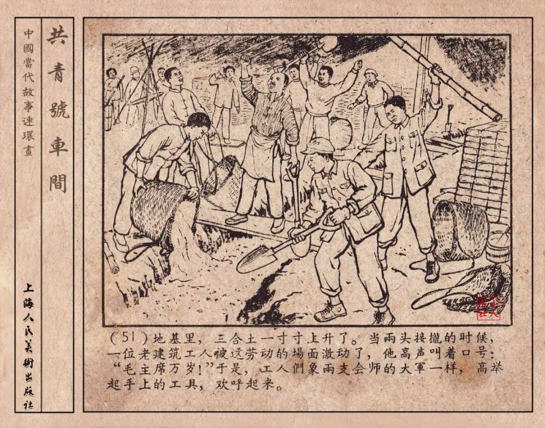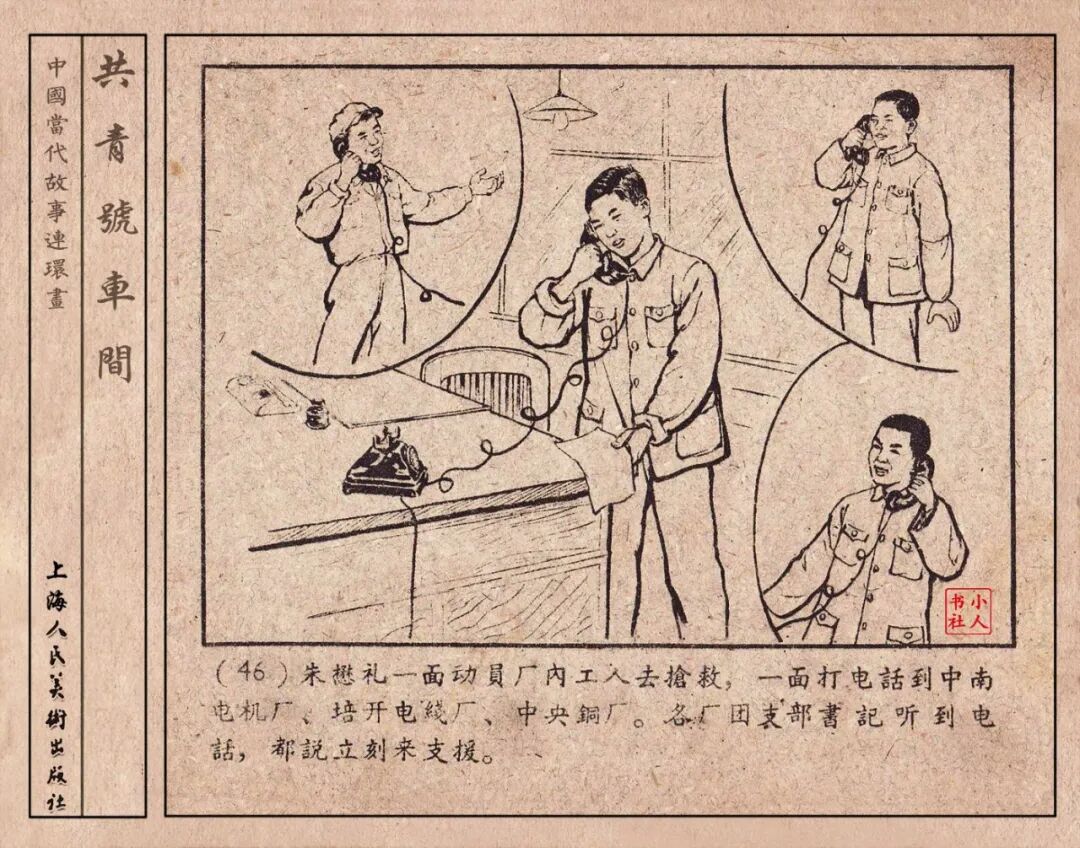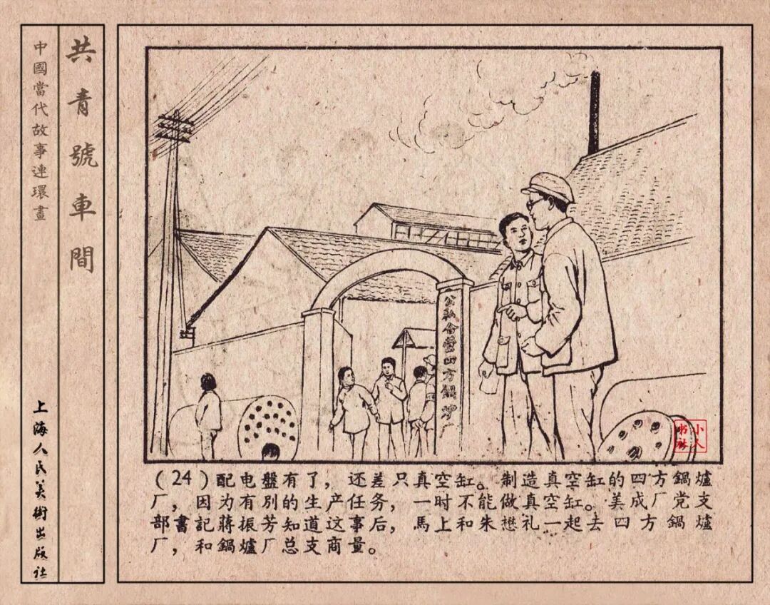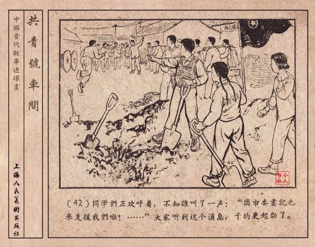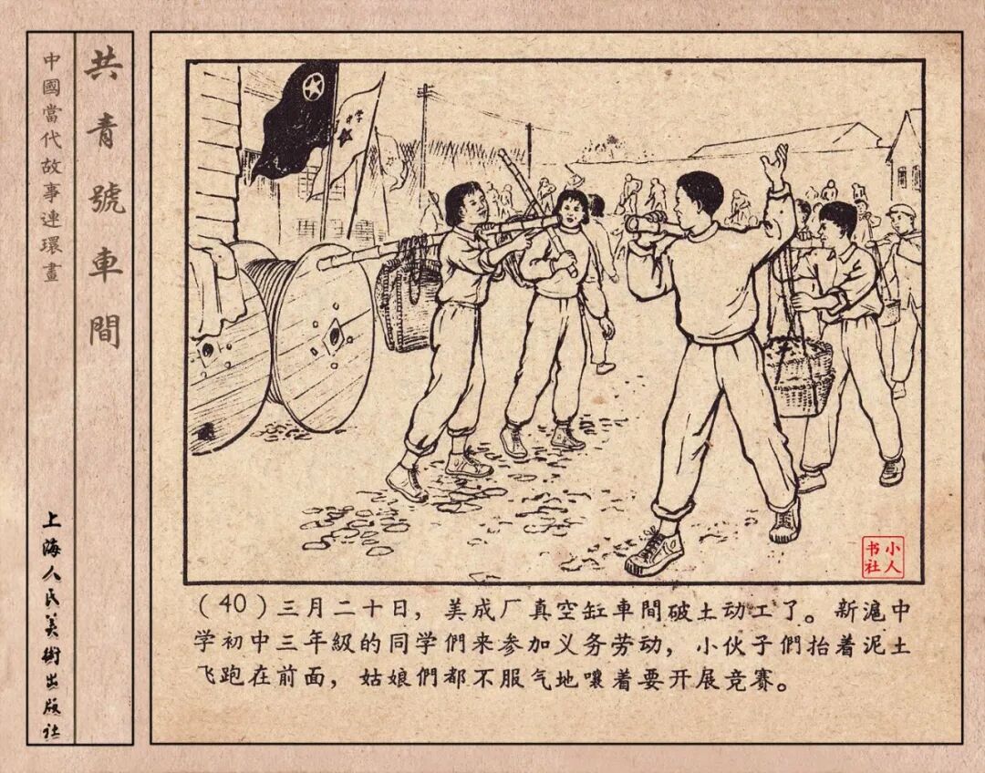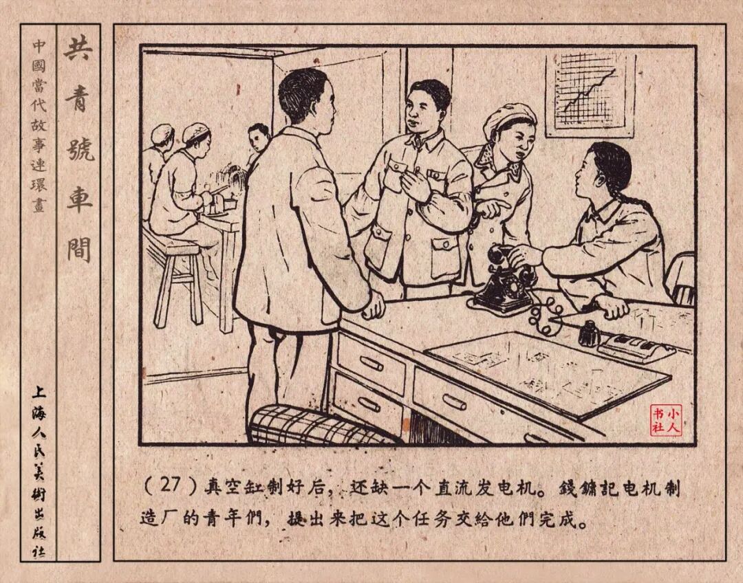 《“共青号”车间》连环画是由何进绘画。故事讲述在总路线的光辉照耀下,各个生产战线上都在大跃进,出现了许多生动的、激动人心的事例。生产力大大的解放了。人与人的关系起了深刻的变化。人们正在经历着“一天等于二十年”的伟大时代。画册不但画出了人们正在百倍雄心地建設伟大的祖国的面貌;也说明了只有在党的领导下,人们才能朝气蓬勃地乘风破浪向社会主义迈进!这本书是其中的一本。内容是讲上海美成电业厂的共青团员和青工们,为了赶上英国,在其他兄弟厂的协助下,建造了一个真空缸间,由团中央命名为“共青号”车间。(本书根据“萌芽”1958年第12期哈宽贵原著改)