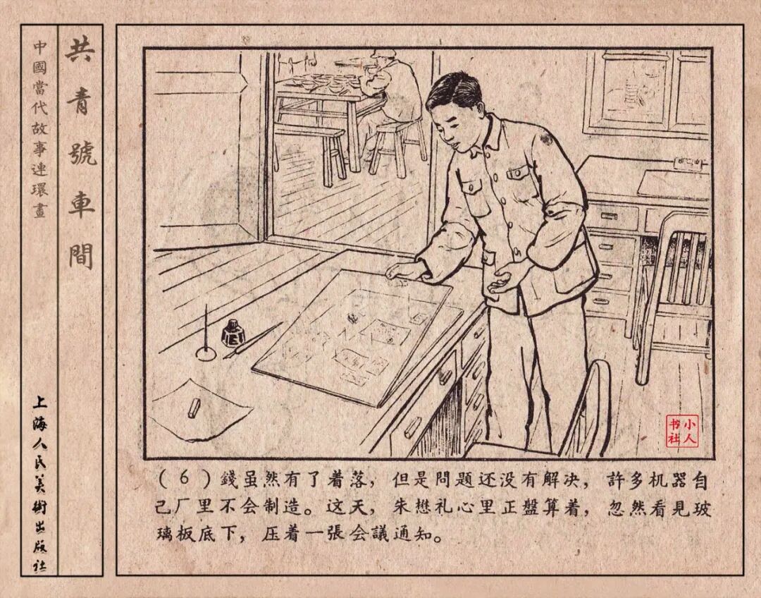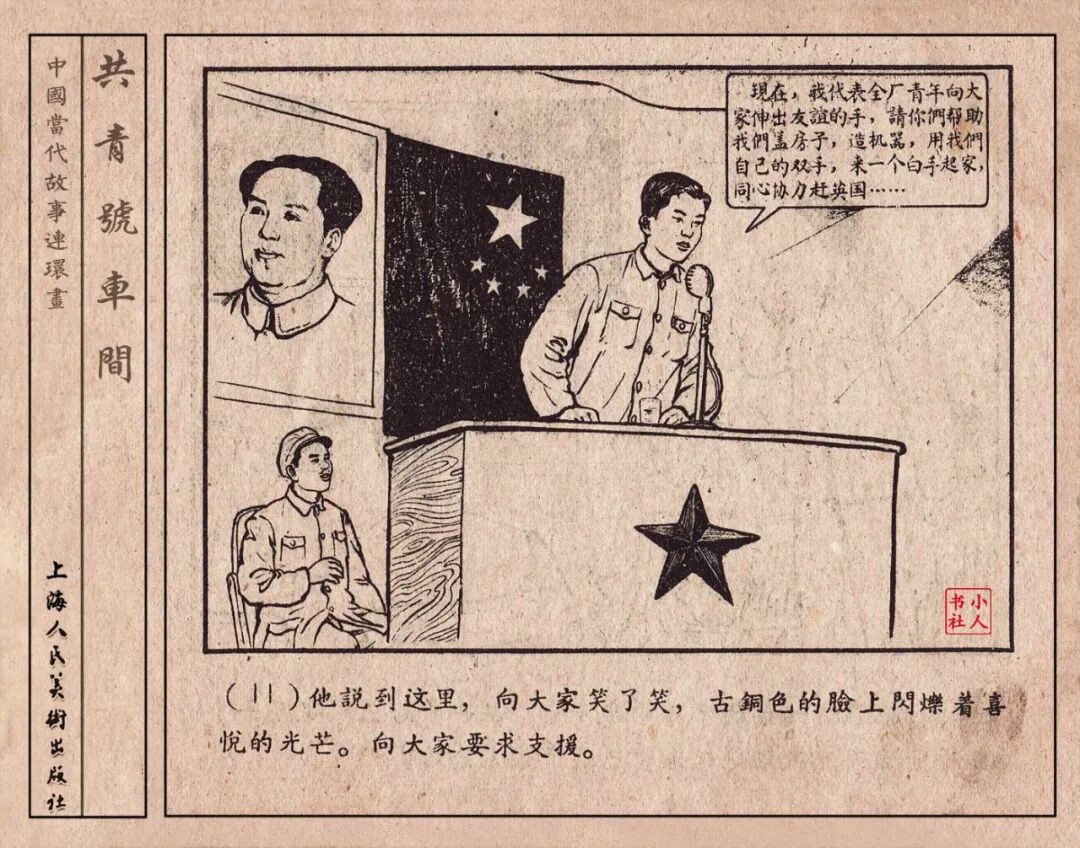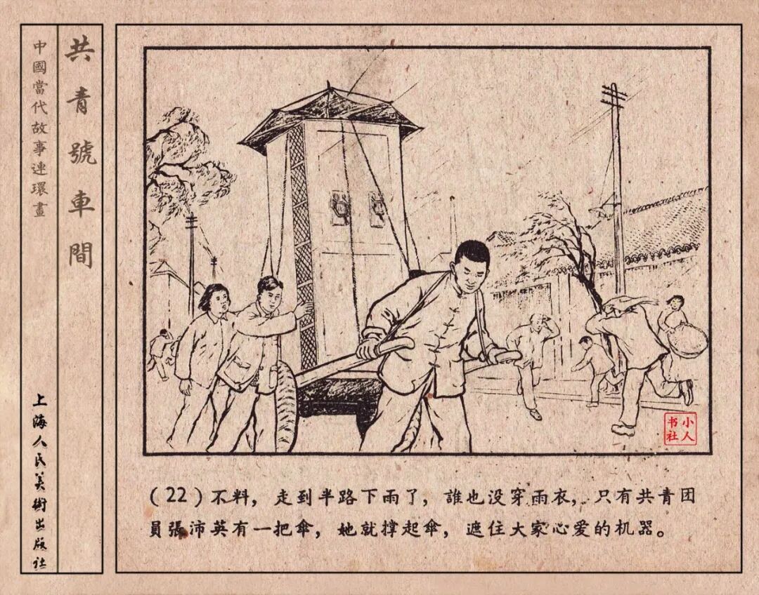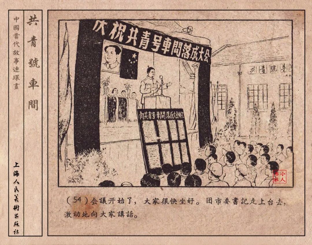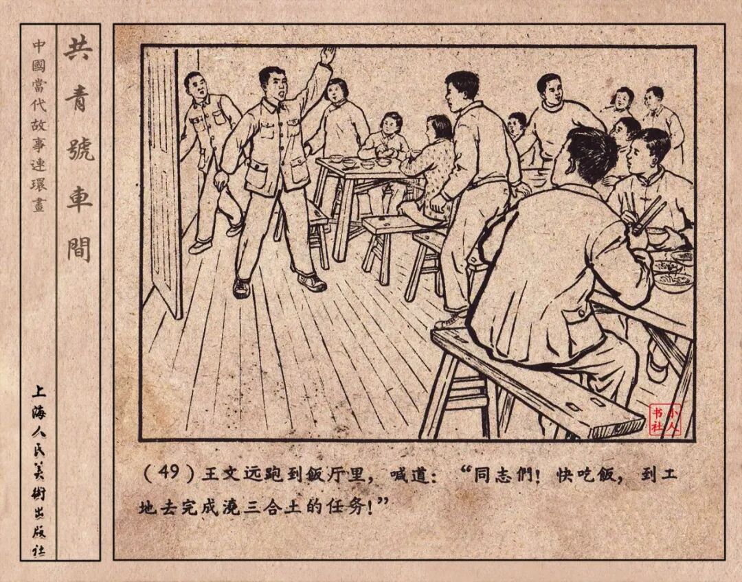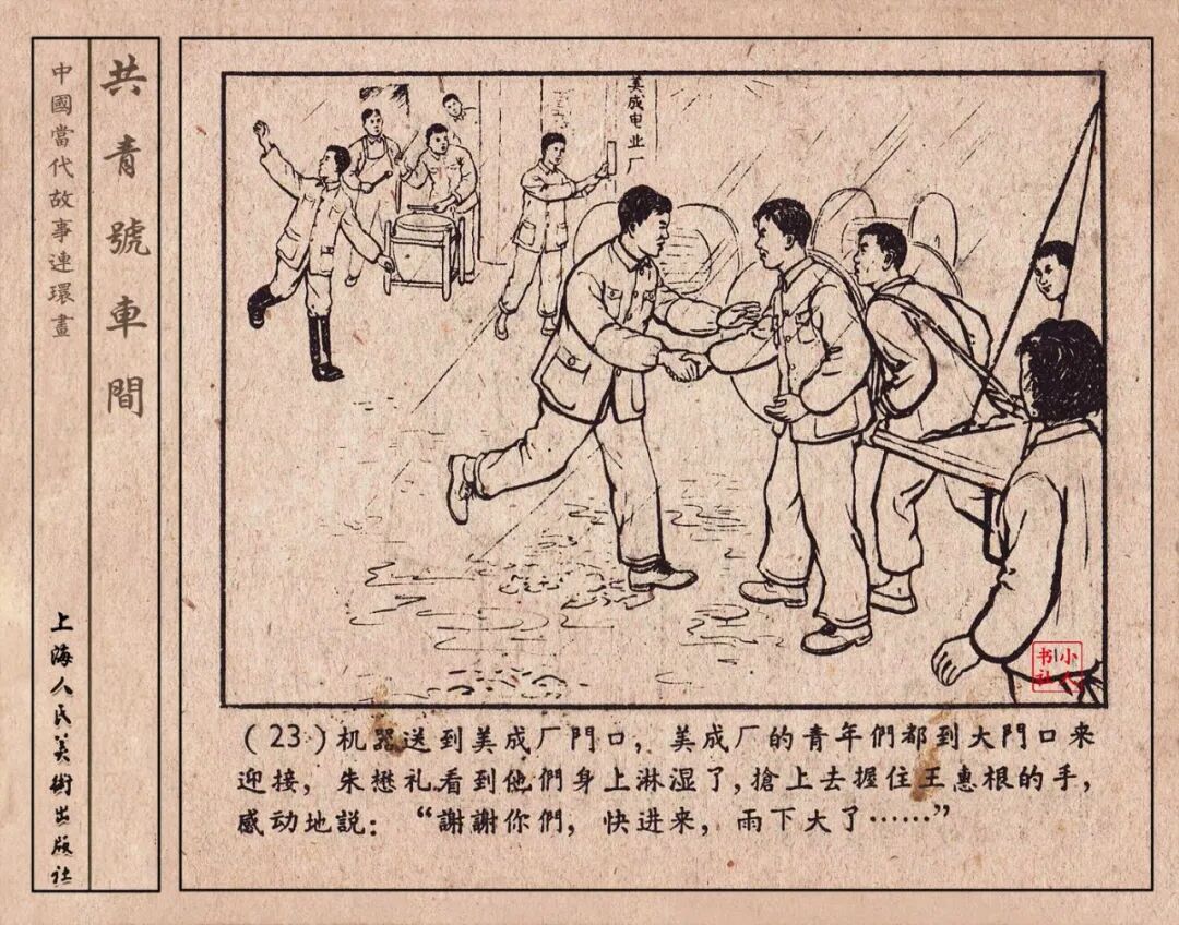 《“共青号”车间》连环画是由何进绘画。故事讲述在总路线的光辉照耀下,各个生产战线上都在大跃进,出现了许多生动的、激动人心的事例。生产力大大的解放了。人与人的关系起了深刻的变化。人们正在经历着“一天等于二十年”的伟大时代。画册不但画出了人们正在百倍雄心地建設伟大的祖国的面貌;也说明了只有在党的领导下,人们才能朝气蓬勃地乘风破浪向社会主义迈进!这本书是其中的一本。内容是讲上海美成电业厂的共青团员和青工们,为了赶上英国,在其他兄弟厂的协助下,建造了一个真空缸间,由团中央命名为“共青号”车间。(本书根据“萌芽”1958年第12期哈宽贵原著改)