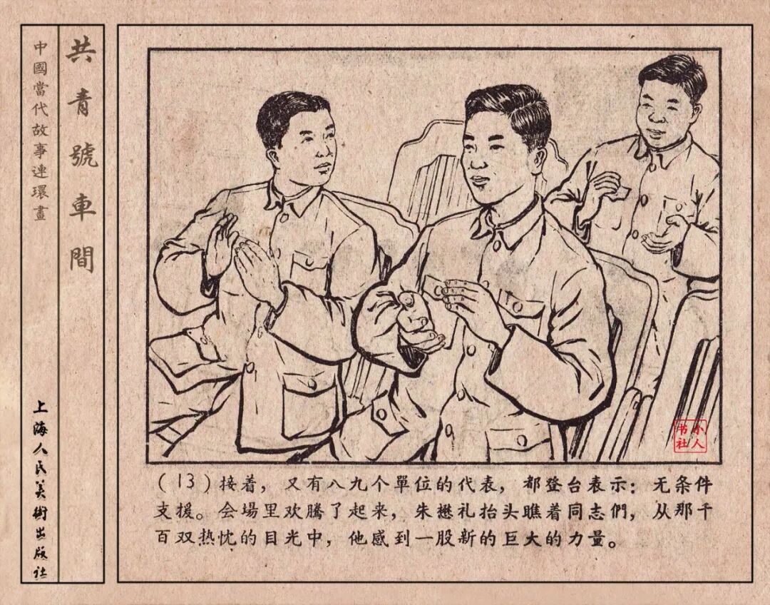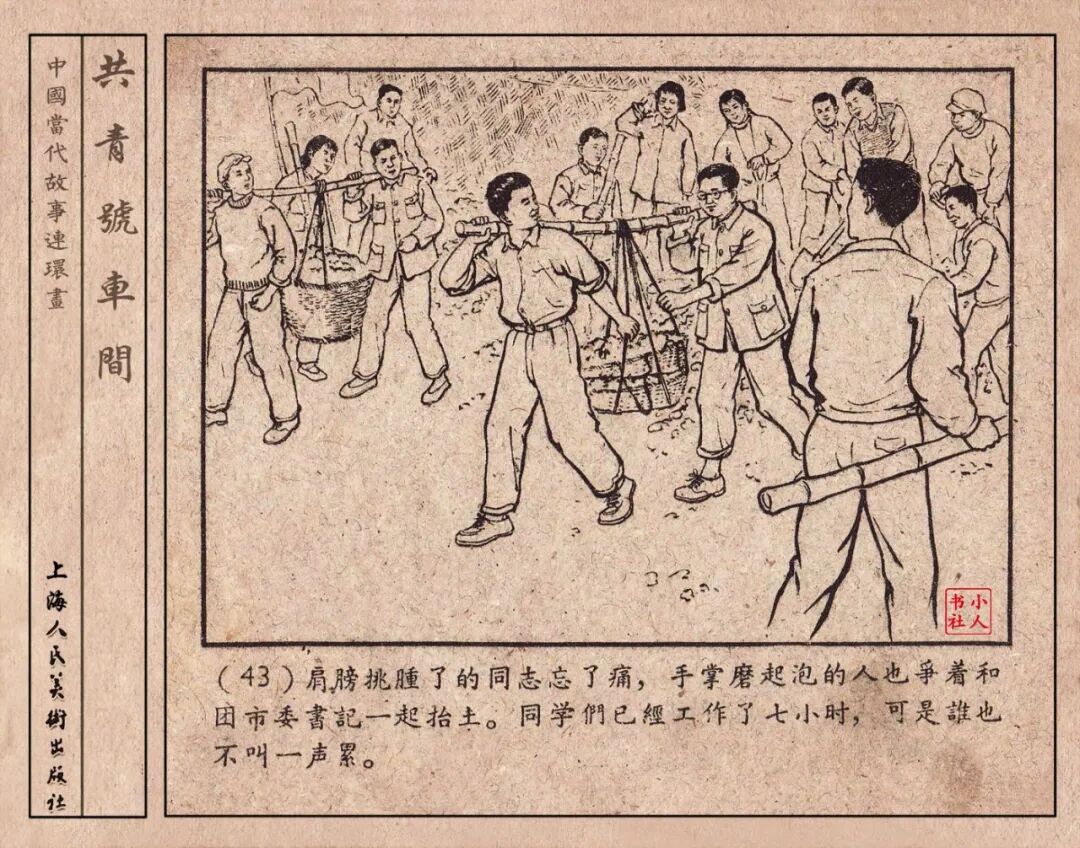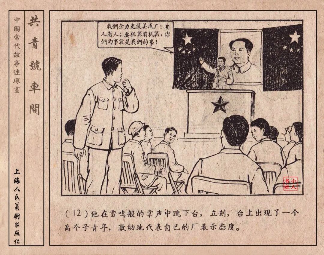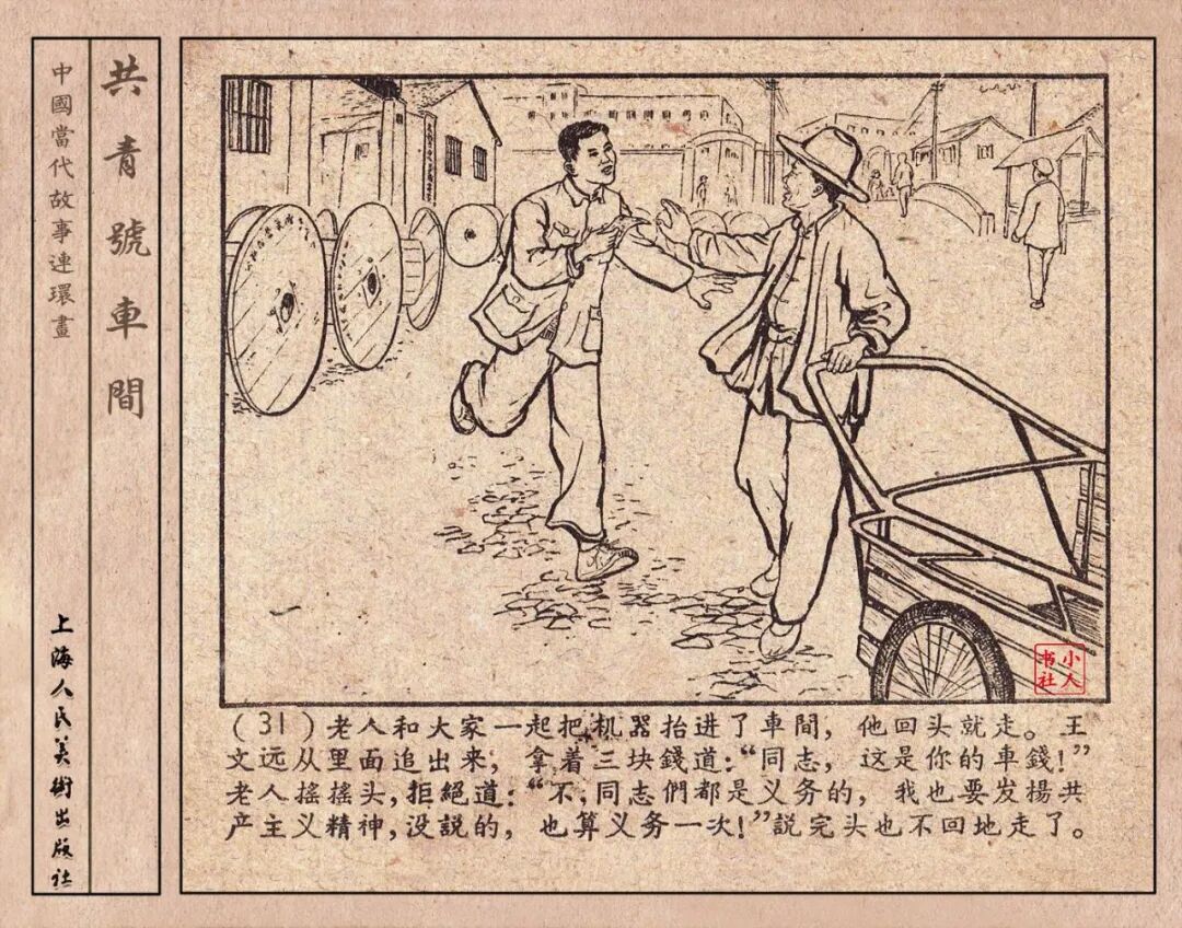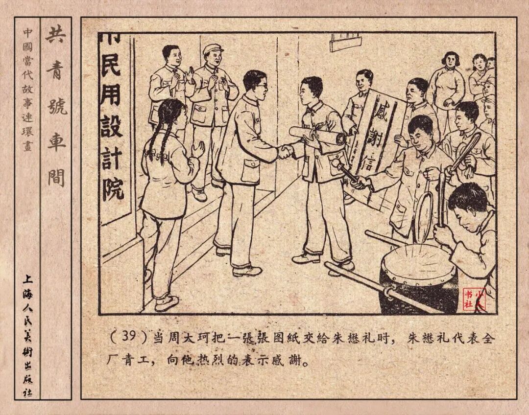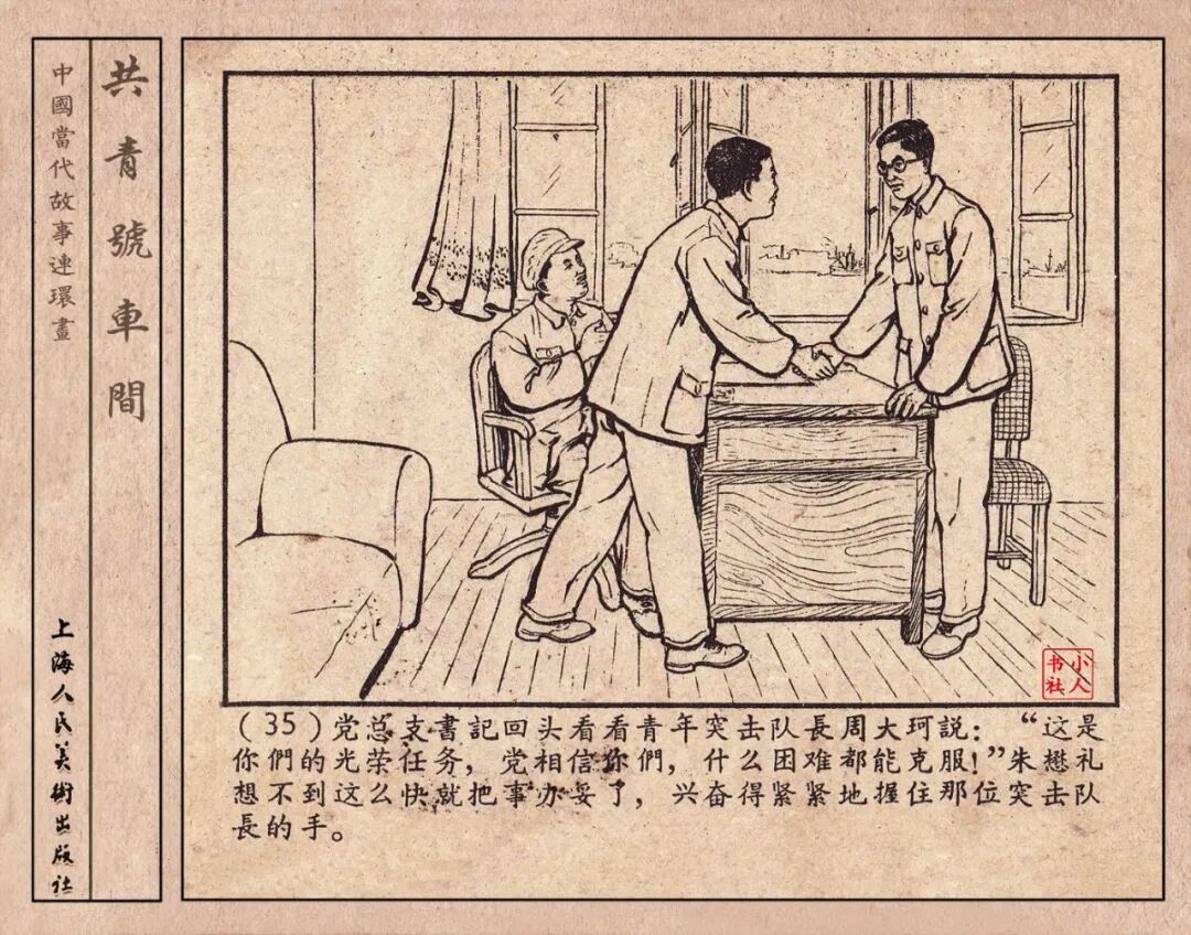 《“共青号”车间》连环画是由何进绘画。故事讲述在总路线的光辉照耀下,各个生产战线上都在大跃进,出现了许多生动的、激动人心的事例。生产力大大的解放了。人与人的关系起了深刻的变化。人们正在经历着“一天等于二十年”的伟大时代。画册不但画出了人们正在百倍雄心地建設伟大的祖国的面貌;也说明了只有在党的领导下,人们才能朝气蓬勃地乘风破浪向社会主义迈进!这本书是其中的一本。内容是讲上海美成电业厂的共青团员和青工们,为了赶上英国,在其他兄弟厂的协助下,建造了一个真空缸间,由团中央命名为“共青号”车间。(本书根据“萌芽”1958年第12期哈宽贵原著改)