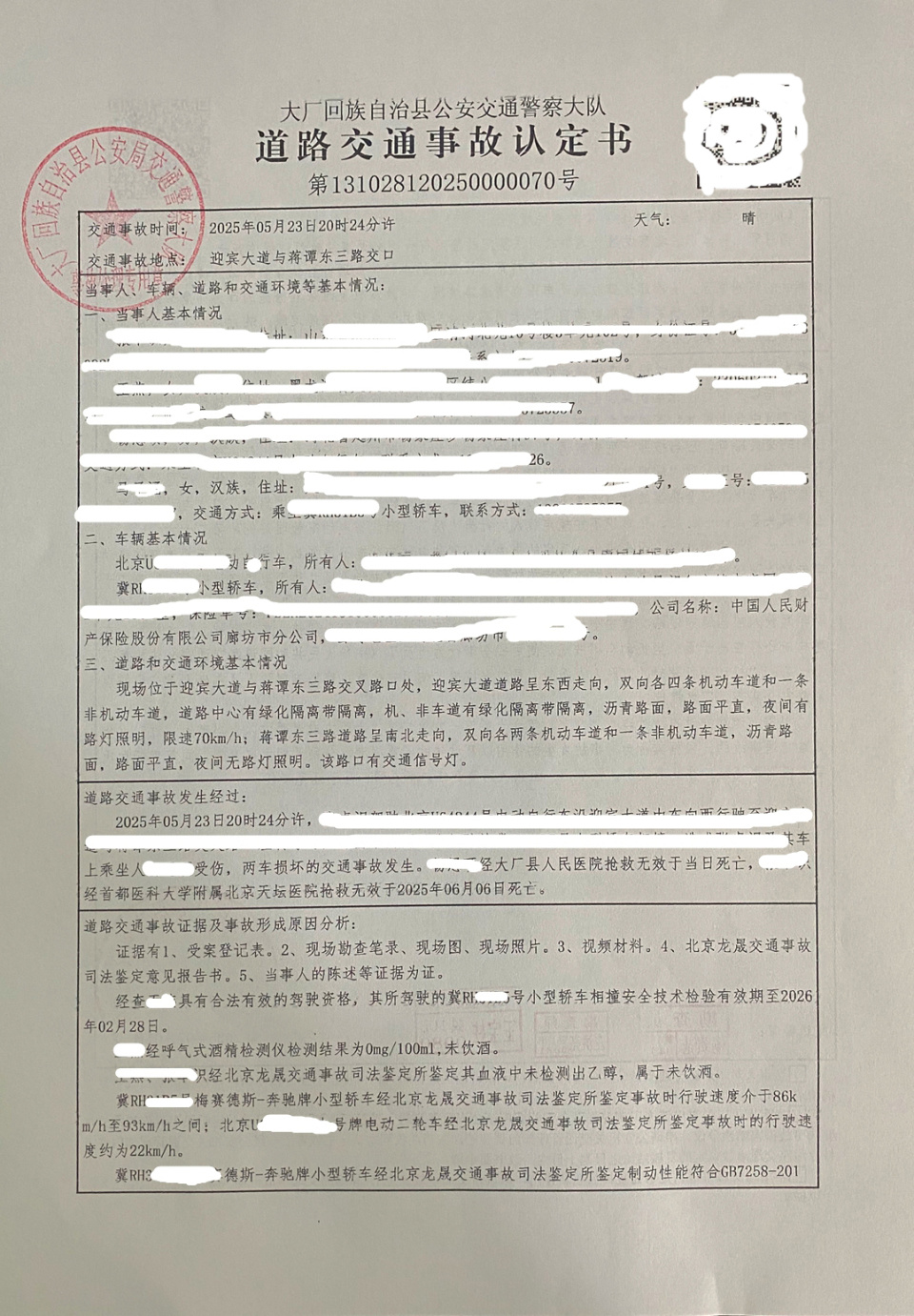 导语:2025年5月23日晚,河北省大厂回族自治县一处十字路口的绿灯下,一场惨烈的碰撞夺走了两名未成年高中生的生命。司法鉴定结果显示,63岁女司机王某红绿灯车速为86-93km/h,严重超速、并分心驾驶 —— 酿成了这起悲剧。这起事故不仅撕开了两个家庭的伤口,更暴露了当前道路交通中潜藏的多重安全隐患,为所有交通参与者敲响警钟。