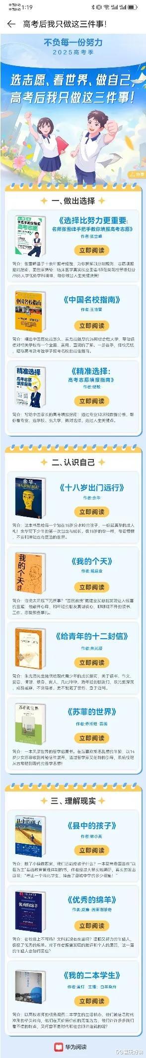 把志愿的事情敲定后,孩子暑假规划也提上了日程。我就去别的应用上也看了看,还真让我发现了一款宝藏应用,我常用的华为阅读上为考生们贴心地准备了高考书单推荐,选的书也都很有水平,正好能让孩子在假期里沉淀下来,书籍由编辑团队精心挑选,可以帮助孩子在正式进入大学前,提前学会“做选择、认识自己、以及理解现实”,为即将到来的大学生活做好知识和思想上的准备。