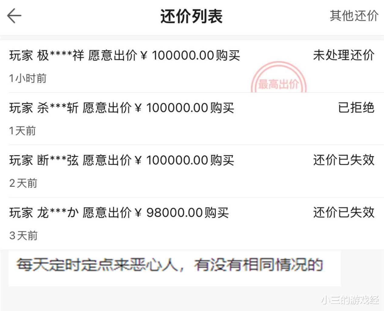 上面这位玩家想问的问题是大家有没有在藏宝阁上被号贩子给盯上呀?被号贩子盯上的角色可是比较惨的。上面这位玩家表示那些号贩子每天定时定点的来恶心人,会用大量的角色对同一个道具进行差不多价格的还价。号贩子这么做就是试探各位玩家的心理承受能力,某些玩家被逼得比较惨了,他们真的有可能会以比较便宜的价格将自己出售的东西卖掉。