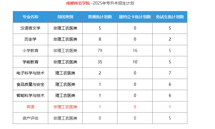 其中【英语】专业在普通批中计划招生1人,建档立卡计划招生0人,免试生计划招生1人,合计2人。具体招生计划如下: