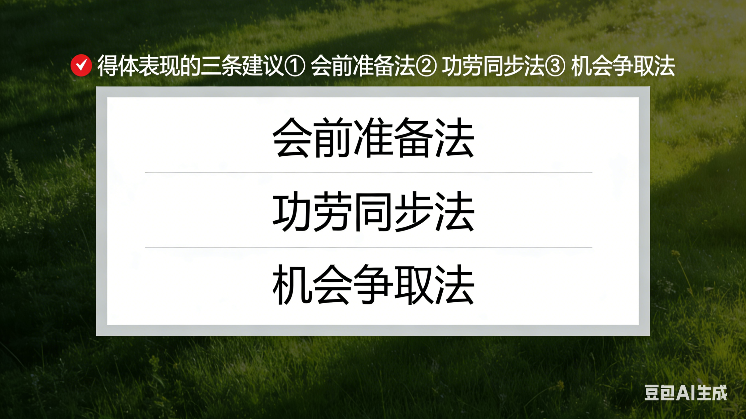 ①会前准备法:开会前,提前把你想说的写下来,哪怕只说一句“我补充一点”,也比全程沉默强。