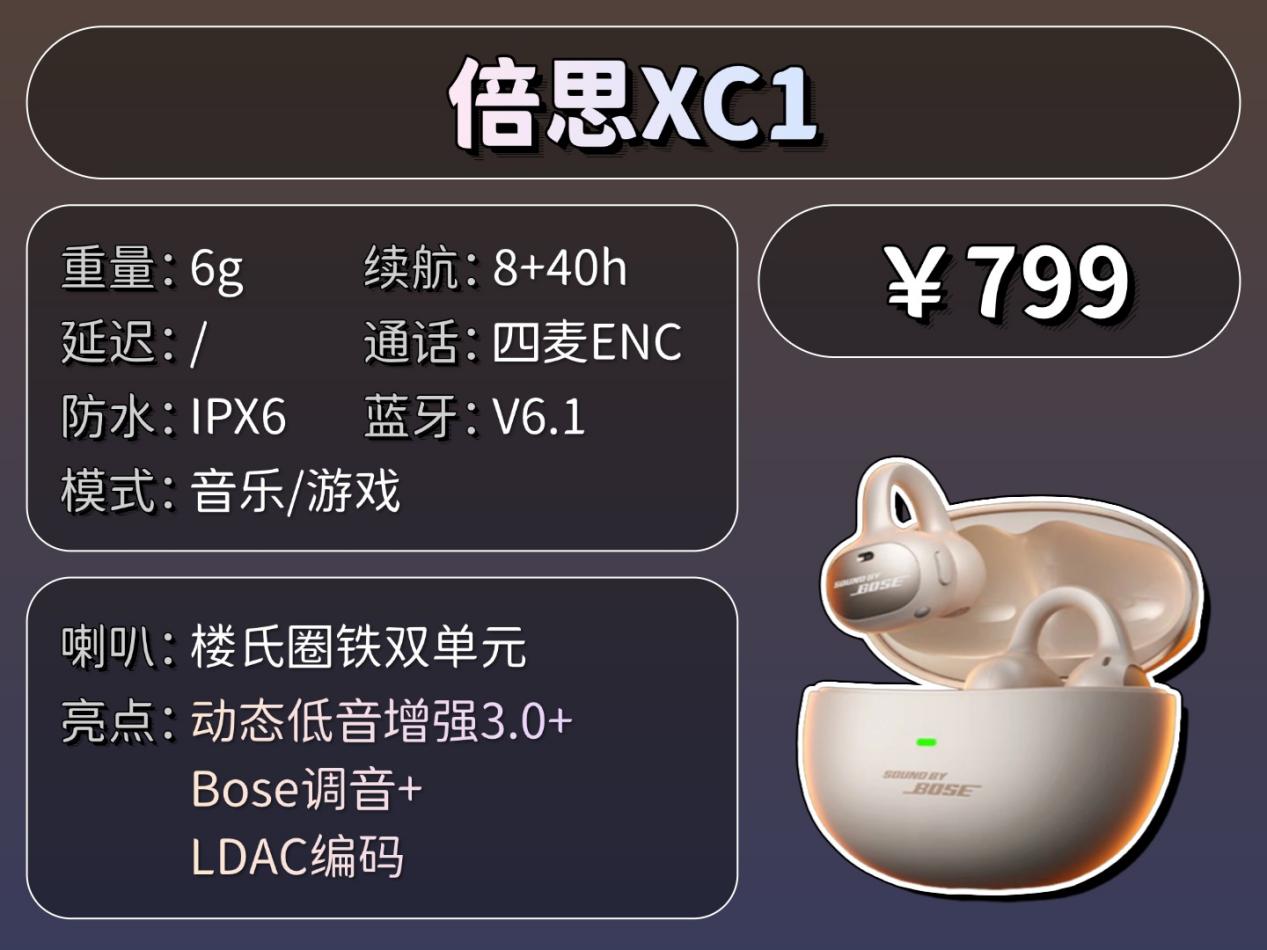 倍思 XC1 在音质上采用楼氏圈铁双单元,兼顾了动圈单元的饱满氛围感与动铁单元的超清解析力,声音细节还原丰富;搭配SuperBass 3.0 动态低音增强技术,可智能优化低频表现,让鼓点下潜更深、更具力量感;同时支持LDAC 高清音频编码,能最大程度留存音乐原生细节,整体听感均衡自然,声场层次清晰分明。