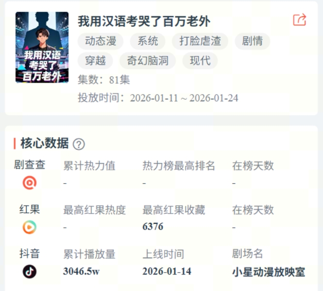 酱油动漫的《我在末日当丧尸,抱养女儿是女帝》和《我用汉语考哭了百万老外》,还有前一周的爆款《玄幻 开局一身无敌大招》,算是其中表现不错的作品。