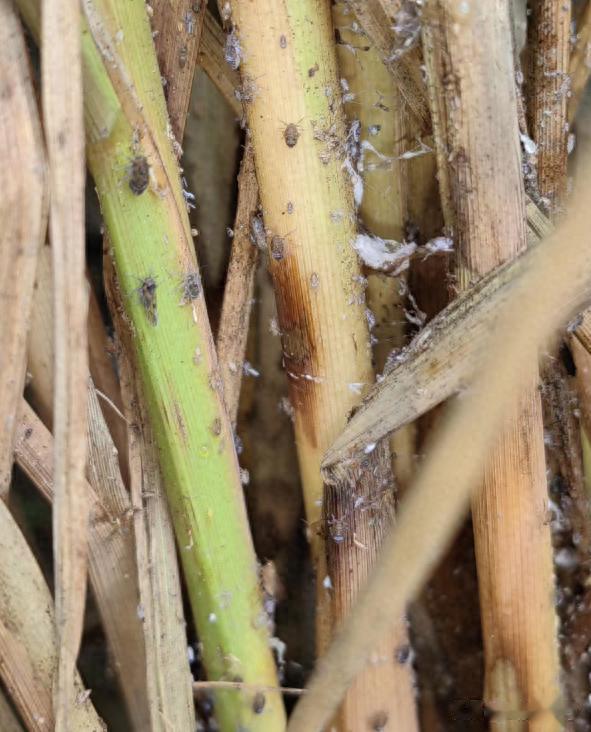 防治药剂:根据防治指标、农药安全间隔期和收割时间等综合选择用药方案,大家可以根据农药标签上的安全间隔期,选择三氟苯嘧啶、烯啶虫胺,不要使用噻虫嗪、吡虫啉、噻嗪酮等抗性水平较高的药剂,谨慎使用吡蚜酮、呋虫胺等药剂。每亩兑水30-40L对准稻株中下部均匀喷雾;无人机用水量不得少于4L,同时田间需保水;无水田块,或者目前不宜上水的水稻田可以用敌敌畏(300-500克)拌土撒施(无人机最好拌细沙,15-20kg),用药后3小时遇雨需及时补治。