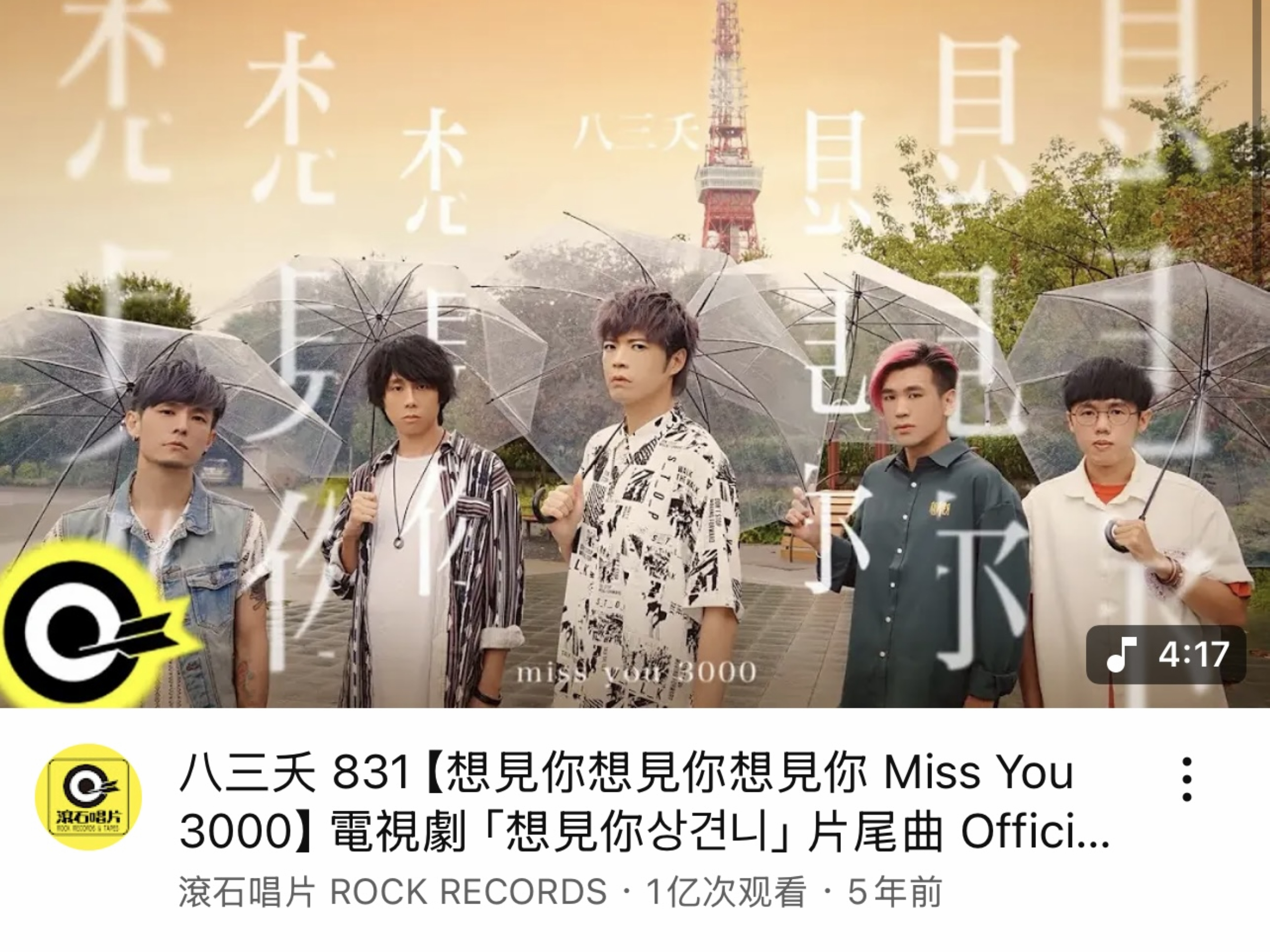摇滚天团八三夭再创里程碑!出道22年来推出无数脍炙人口的经典歌曲,其中与夯剧《想见你》一同爆红的代表作《想见你想见你想见你》,今(23)日正式突破1亿次MV观看数,荣登“亿级俱乐部”,五位团员激动表示:这一亿次播放,是我们与歌迷一起走过的每一段时光!