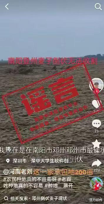 近日,某自媒体平台用户“河南老刘”发布“南阳邓州两百亩小麦倒伏无法收割”相关内容,引发网民关注讨论。