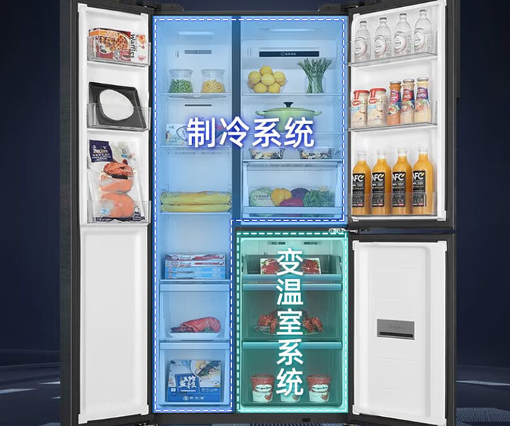 501升T字门分储,冷藏186L(内置鲜活保湿舱),115L变温室(支持-20℃~5℃宽幅变温),冷冻200L。双变频驱动,日耗电0.85度。