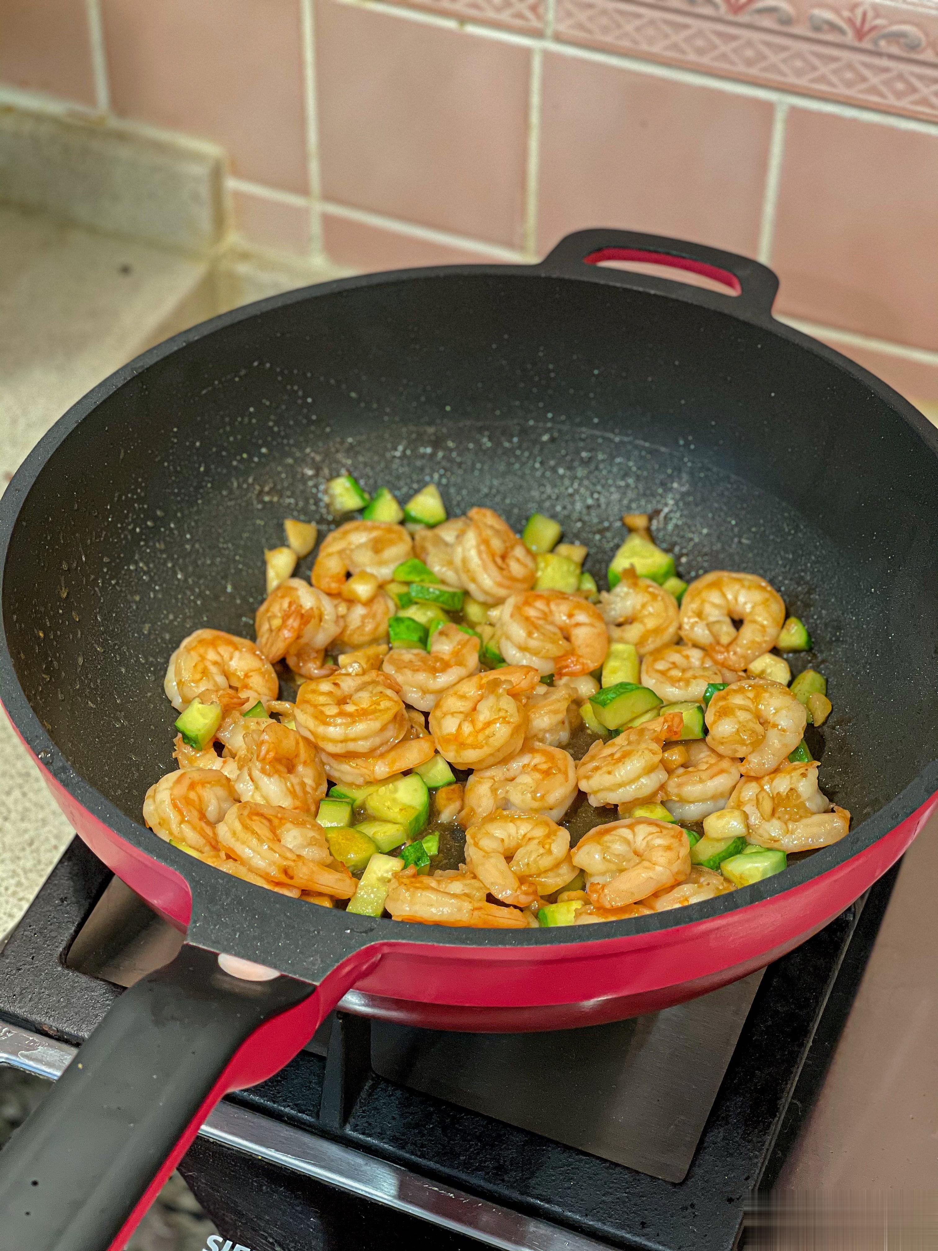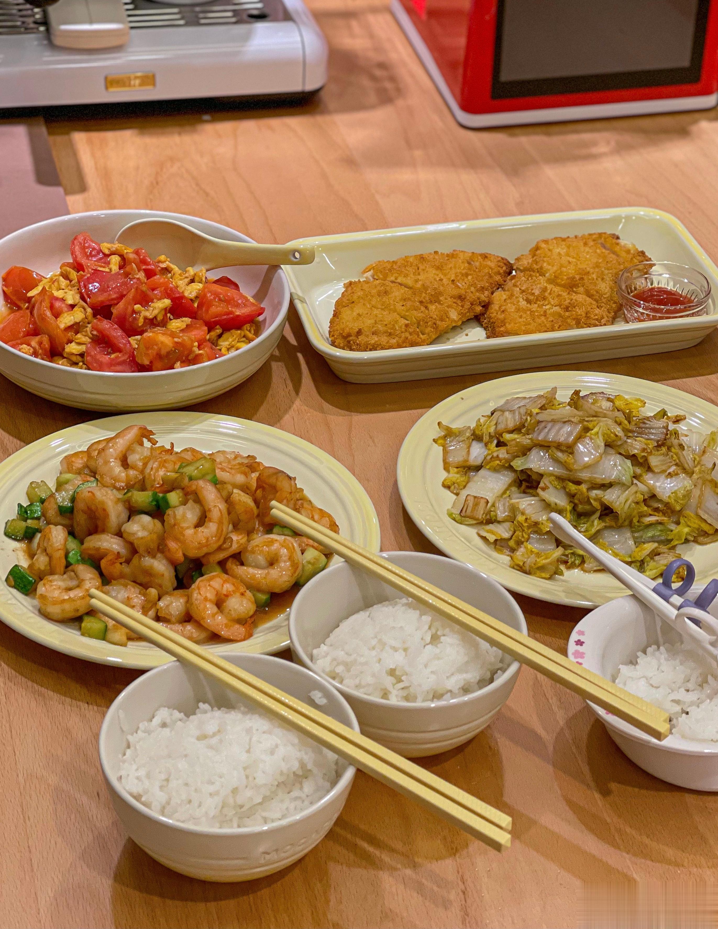 乔乔一进门就可以吃饭啦黄瓜炒虾仁+炸鸡排+西红柿炒鸡蛋+清炒娃娃菜。蒸炖锅蒸米饭