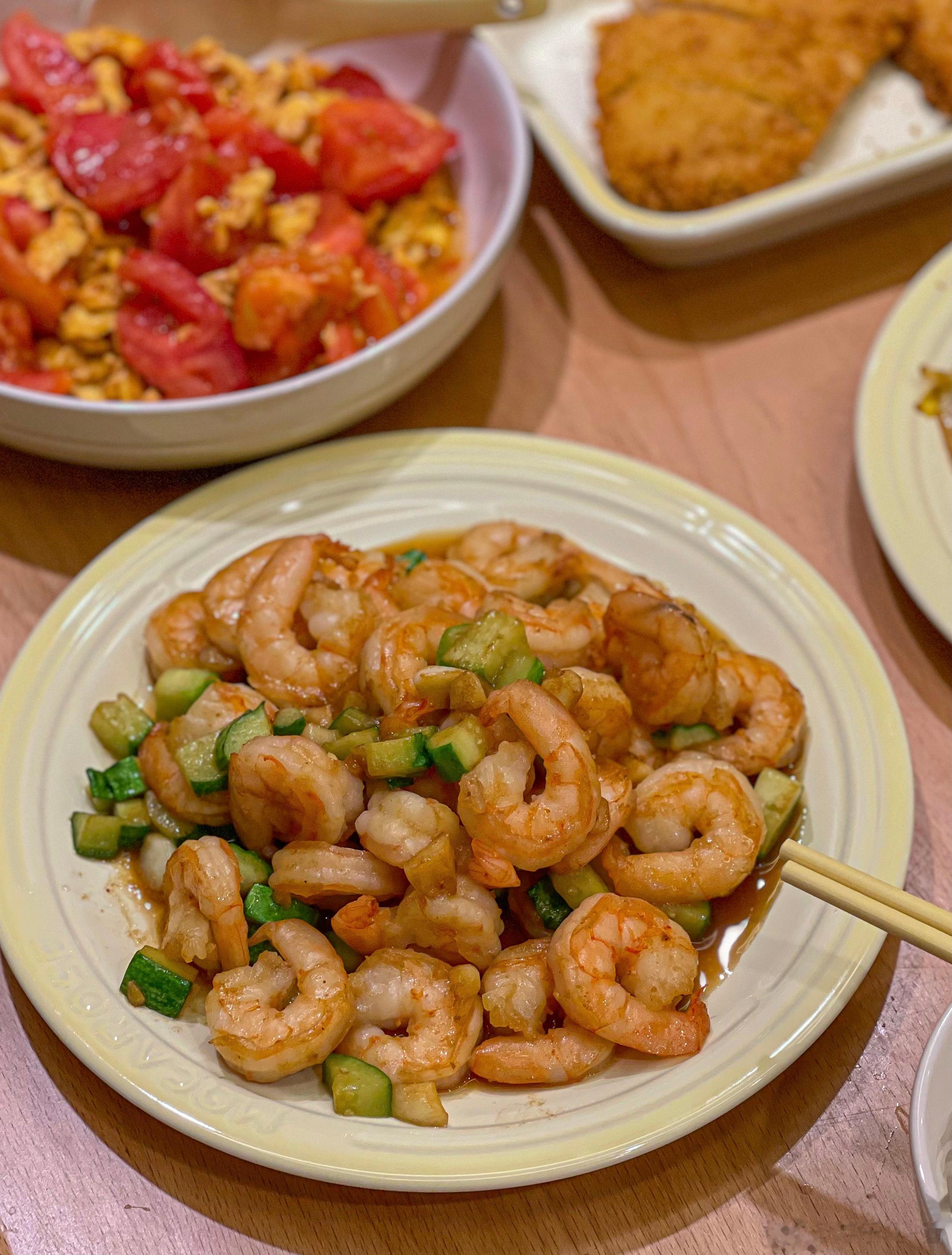 黄瓜炒虾仁+炸鸡排+西红柿炒鸡蛋+清炒娃娃菜。