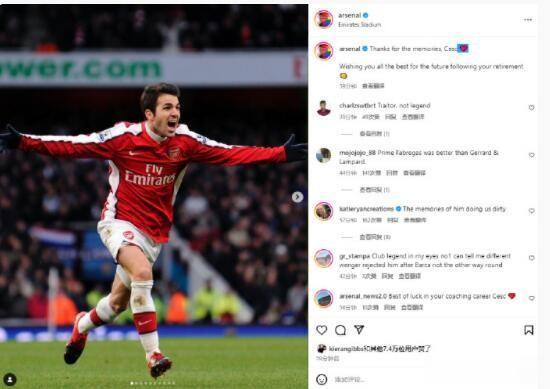 法布雷加斯退役,阿森纳发祝福:感谢那些回忆,塞斯克,祝你退役后的未来一切顺利。 法布雷加斯职业生涯一共出场849次,送出助攻253次,打进144球。 获得了 1个世界杯 2个欧洲杯 2个英超 1个欧洲超级杯 1个欧联杯 1个世俱杯 1个西甲 2个社区盾杯 2个足总杯 1个联赛杯 1个国王杯 2个西班牙超级杯。