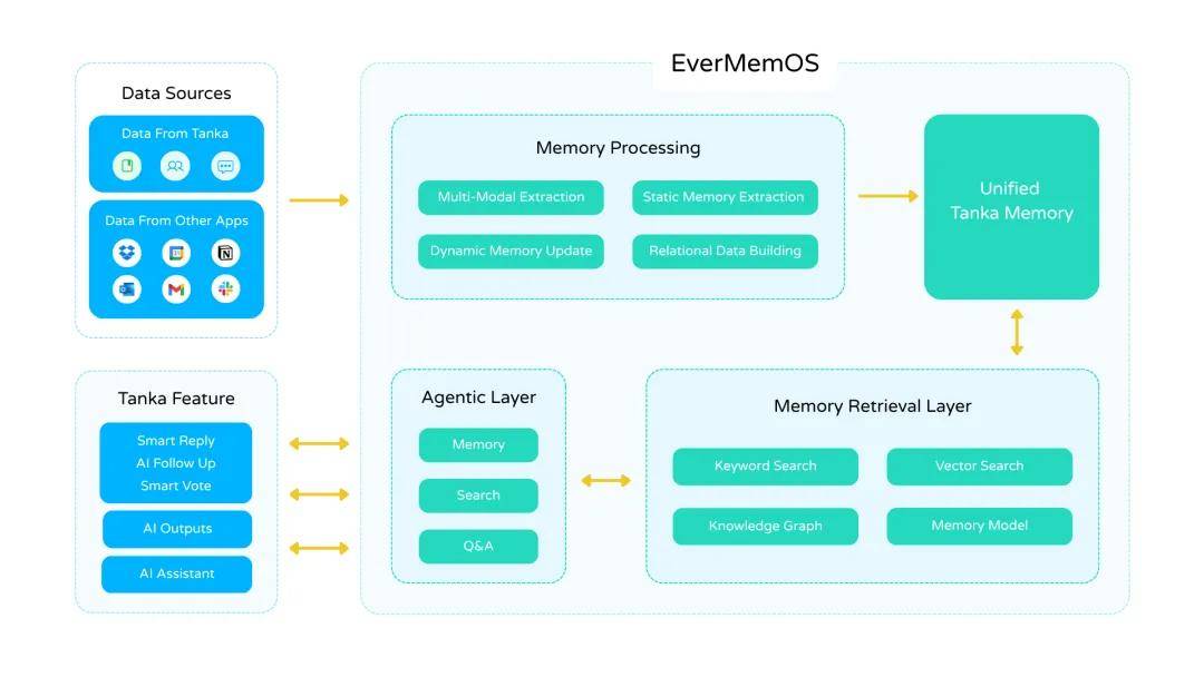 EverMind 团队近日宣布正式发布其旗舰产品 EverMemOS,这是一款面向人工智能智能体的世界级长期记忆操作系统。它旨在成为未来智能体的数据基础设施,为 AI 赋予持久、连贯、可进化的 “灵魂”。