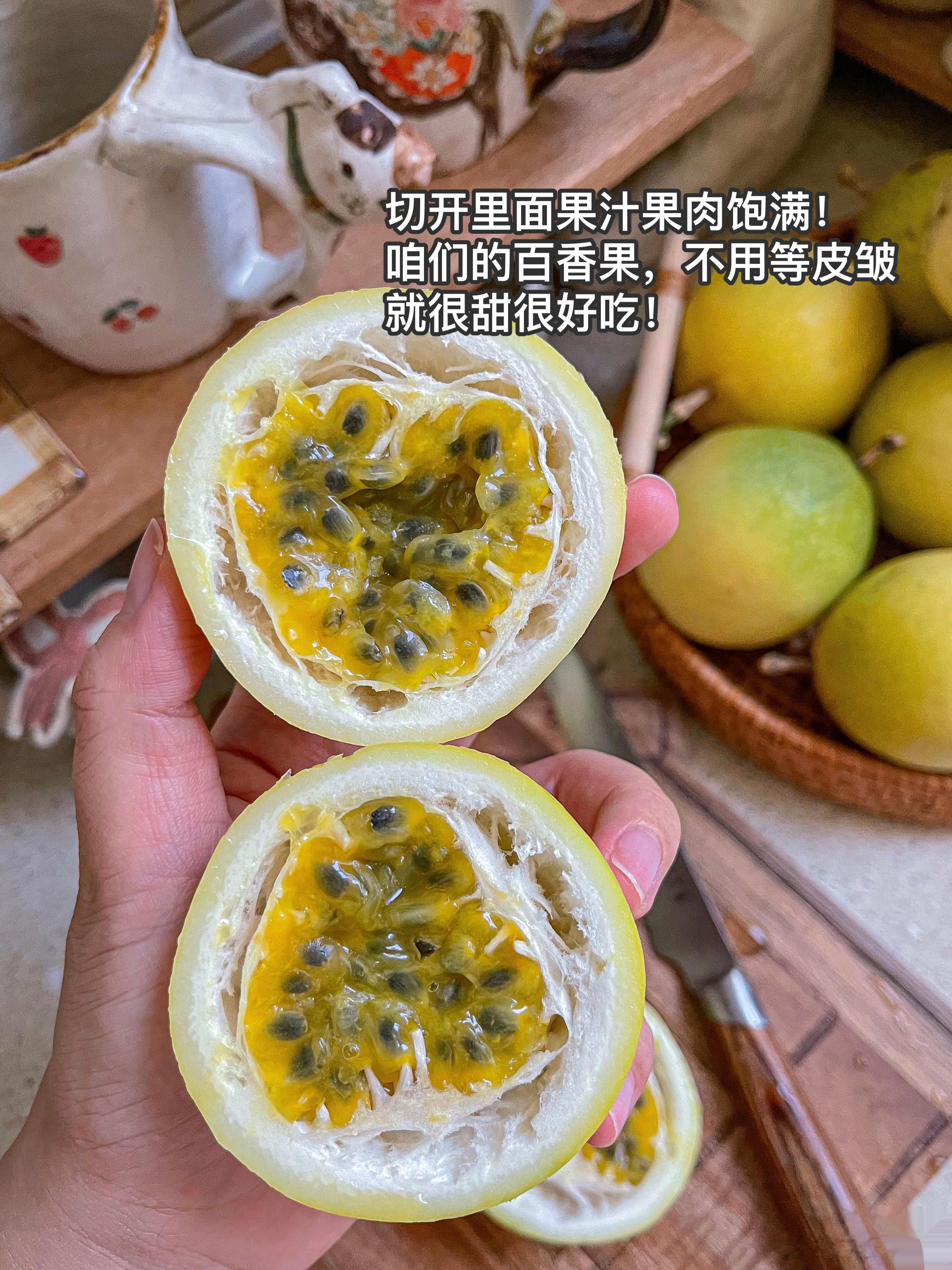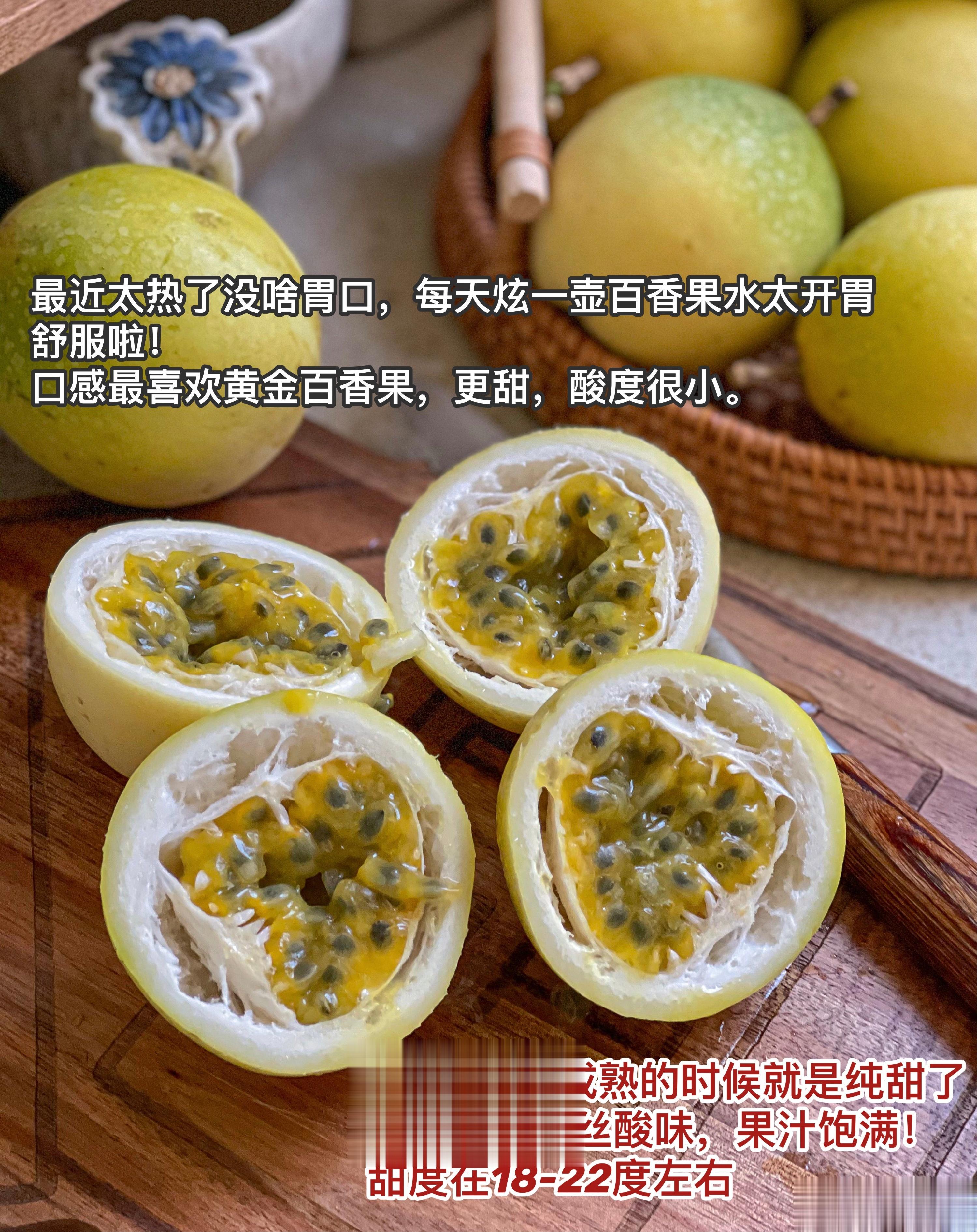 钦蜜9号集齐了百香果的所有优点,清甜可口无酸味。甜度在18-22度左右(一般百香果都是放到皱皮了才没那么酸,但钦蜜9号八成熟的时候就是纯甜了,几乎不带一丝酸味)。果汁饱满!