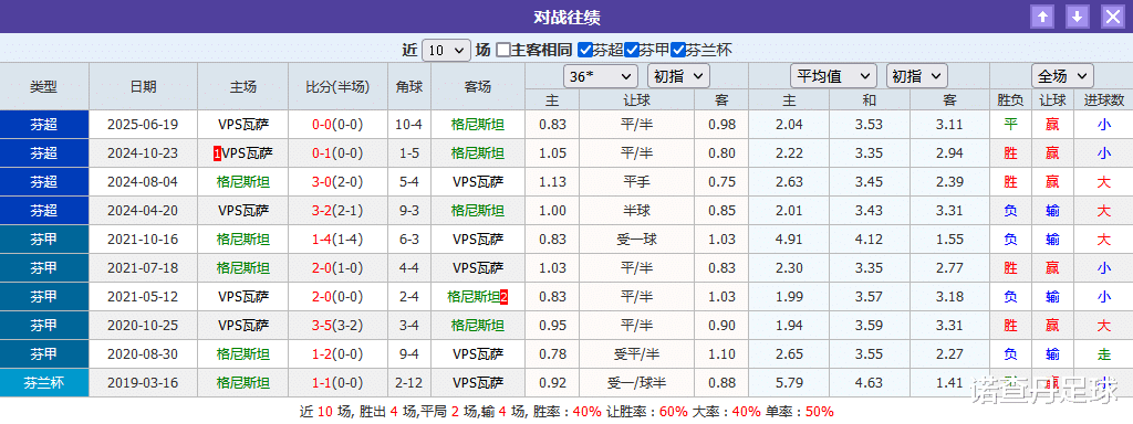 对阵背景:这是1场芬超的比赛,小众些,但是却也是14场比赛中的1场,毕竟5大联赛才刚刚部分开启。否则的话,这种联赛比赛不会构成14场比赛的。双方主客场战绩对比323vs324,比较接近也都比较1般的对决。双方直接往绩交手424,仍然是均衡的对阵结果。本场比赛的筹码倾向性无。