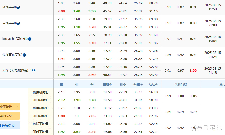 技术分析:指数上,立先威后。先开的立给出了232组合,稍高均值明显的低赔主胜,微低均值的大冷平局,以及较低均值的次冷客胜。立初盘30偏离均值较多,而冷平偏离均值较少,这是1种结构,但是单凭这1点,并不能做出判断,尤其筹码倾向性不明显的时候,这种结构属于值得注意但是并不充分的条件。威随后提0降3维持1不变。主胜大降明显,大降后次最低,较低均值较多,仍然光面友好,且完全光面友好。冷平维持了微低均值不变,这加成了对于其打出的看好,这属于随盘方维持不变,最小化受关注的指数手法。同时客胜大增后较高均值。威随盘自身30走极端,对应立30也互走极端。再结合随盘方对于并不热的冷平维持不变,维持相对低于均值的指数手法,从而这场比赛做出了30互走极端保护冷平,而冷平本身主动最小化受关注,从而这场比赛做出了单冷平局的判断。这场比赛可以说是本期14场冷门比赛中最好的1场,其次是法乙红星的那场的。供参考。