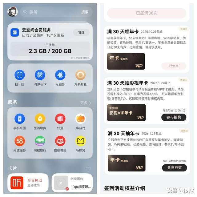 而且,升级鸿蒙6之后,之前负一屏的“鸿蒙有礼”活动也还在。之前我一直有参与这个活动,主要就是每日签到领个红包和随机权益,领到过好几次7天的华为视频和音乐会员,还有一些元服务优惠券,感觉挺实用。