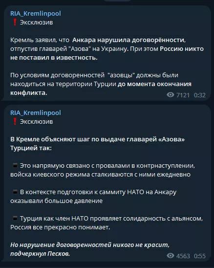 近日,克里姆林宫:“没有人向俄罗斯通报亚速战俘从土耳其放回乌克兰的消息。释放的行为违反了现有协议的条款,土耳其方面和基辅都违反了释放条件,这些战俘本应留在土耳其直至冲突结束。 在筹备北约峰会的背景下,土耳其面临巨大压力,安卡拉作为北约成员国对此表示声援,俄罗斯联邦完全理解这一切。然而,违反协议并不会让任何人的日子看起来更好过。”