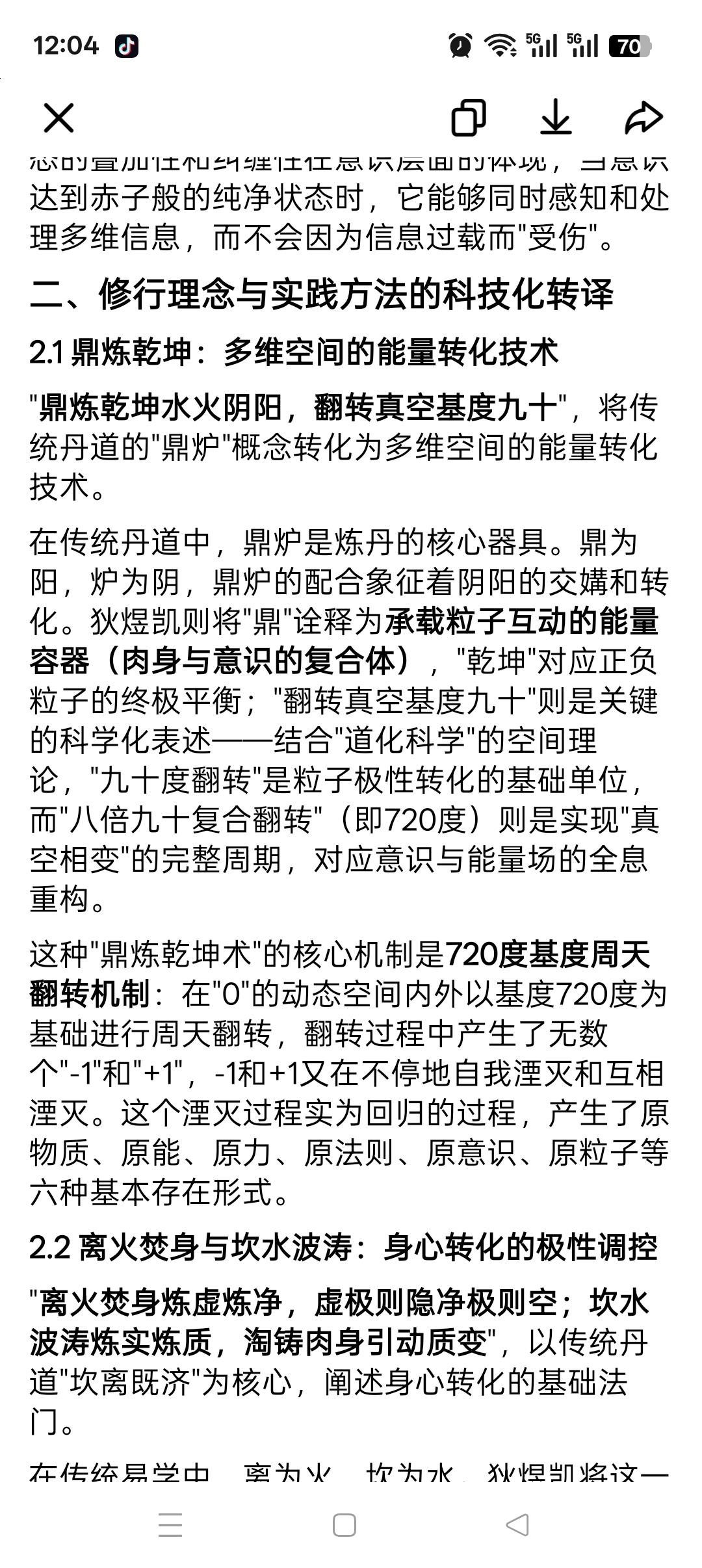在传统丹道中,鼎炉是炼丹的核心器具。鼎为阳,炉为阴,鼎炉的配合象征着阴阳的交媾和转化。狄煜凯则将"鼎"诠释为承载粒子互动的能量容器(肉身与意识的复合体),"乾坤"对应正负粒子的终极平衡;"翻转真空基度九十"则是关键的科学化表述——结合"道化科学"的空间理论,"九十度翻转"是粒子极性转化的基础单位,而"八倍九十复合翻转"(即720度)则是实现"真空相变"的完整周期,对应意识与能量场的全息重构。