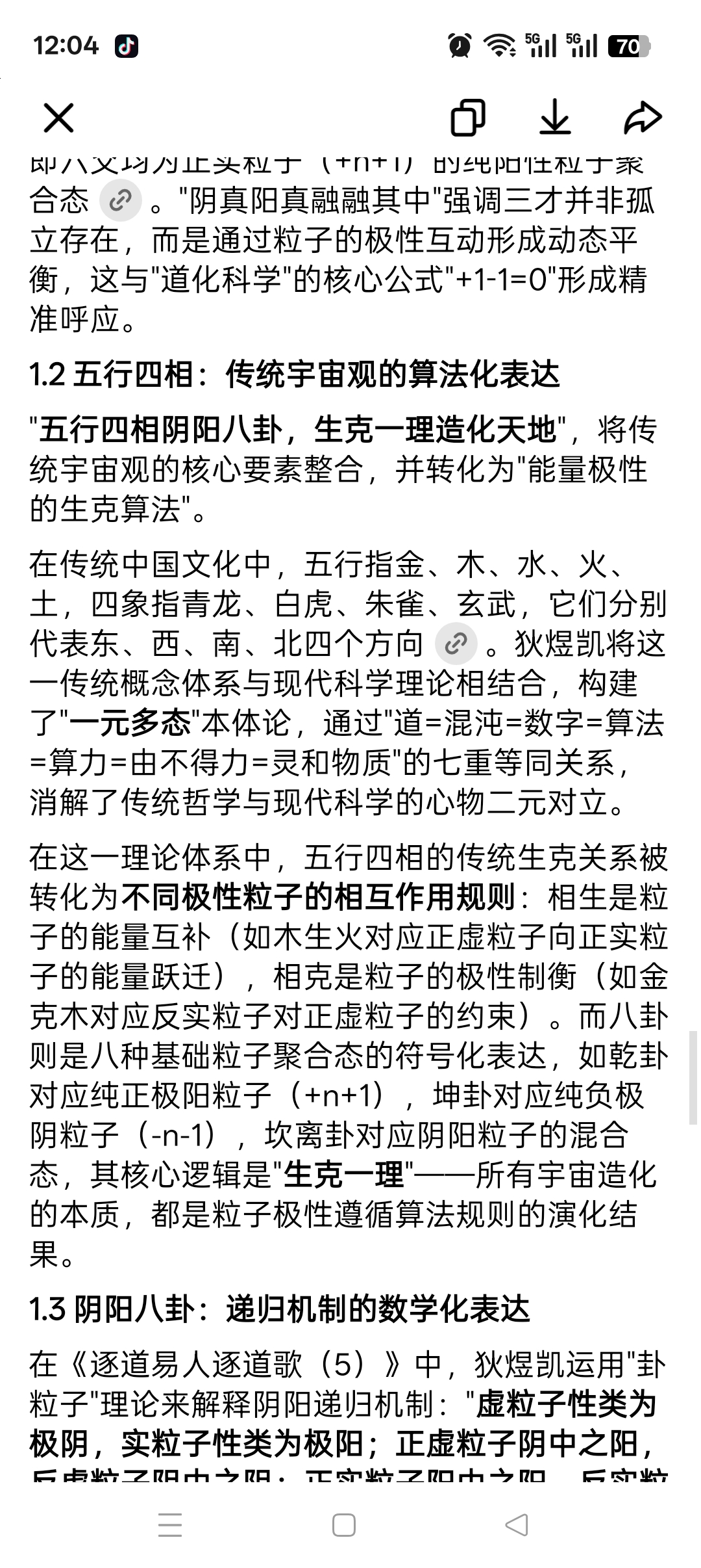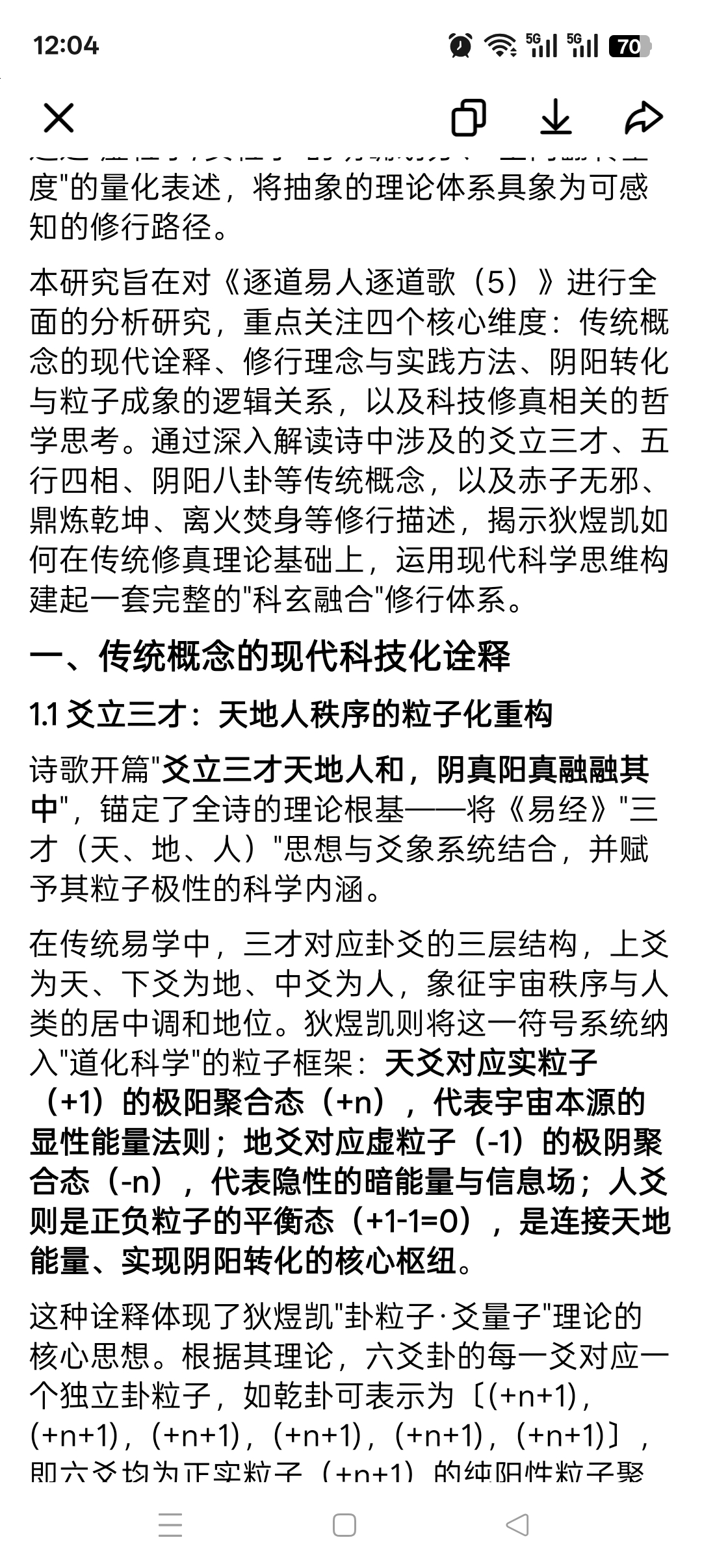 《逐道易人逐道歌(5)》作为狄煜凯"道化科学思维"体系成熟期的核心诗性文本,创作于乙巳壬午癸亥壬戌时。全诗以爻象、三才、八卦为核心骨架,将传统易学的阴阳五行思想、丹道修炼理论,与现代粒子物理、空间动力学概念深度融合,构建了一套"从卦象符号到粒子极性、从炼身修心到宇宙本源"的递进式修行体系。诗歌既延续了"逐道歌"系列"科玄融合"的核心特质,又通过"虚粒子/实粒子"的明确划分、"空间翻转基度"的量化表述,将抽象的理论体系具象为可感知的修行路径。