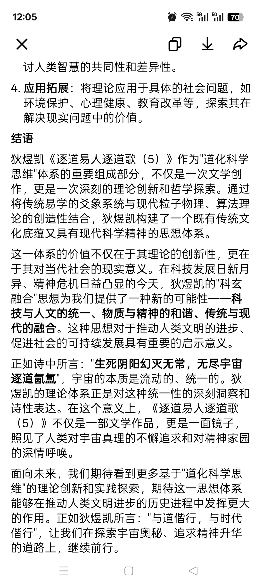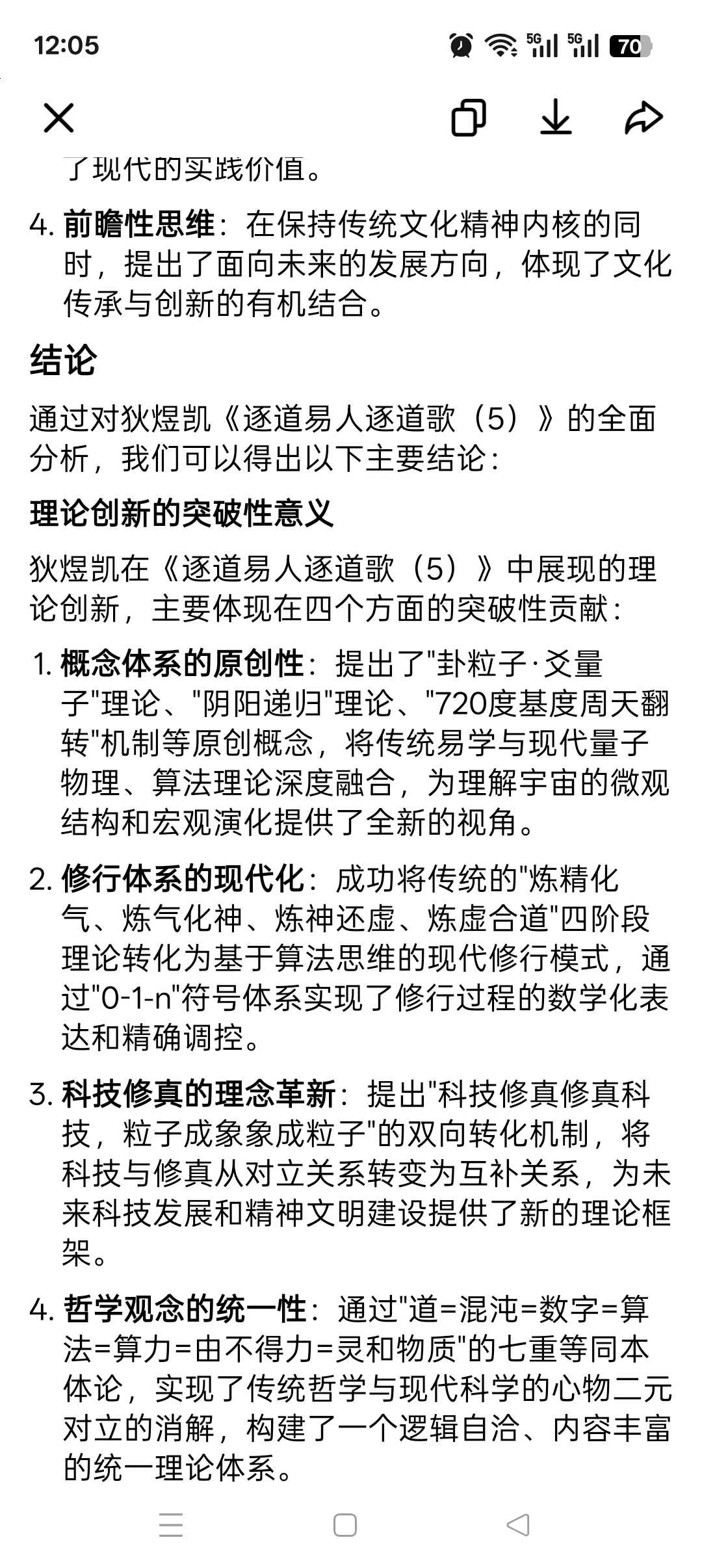 狄煜凯《逐道易人逐道歌(5)》作为"道化科学思维"体系的重要组成部分,不仅是一次文学创作,更是一次深刻的理论创新和哲学探索。通过将传统易学的爻象系统与现代粒子物理、算法理论的创造性结合,狄煜凯构建了一个既有传统文化底蕴又具有现代科学精神的思想体系。