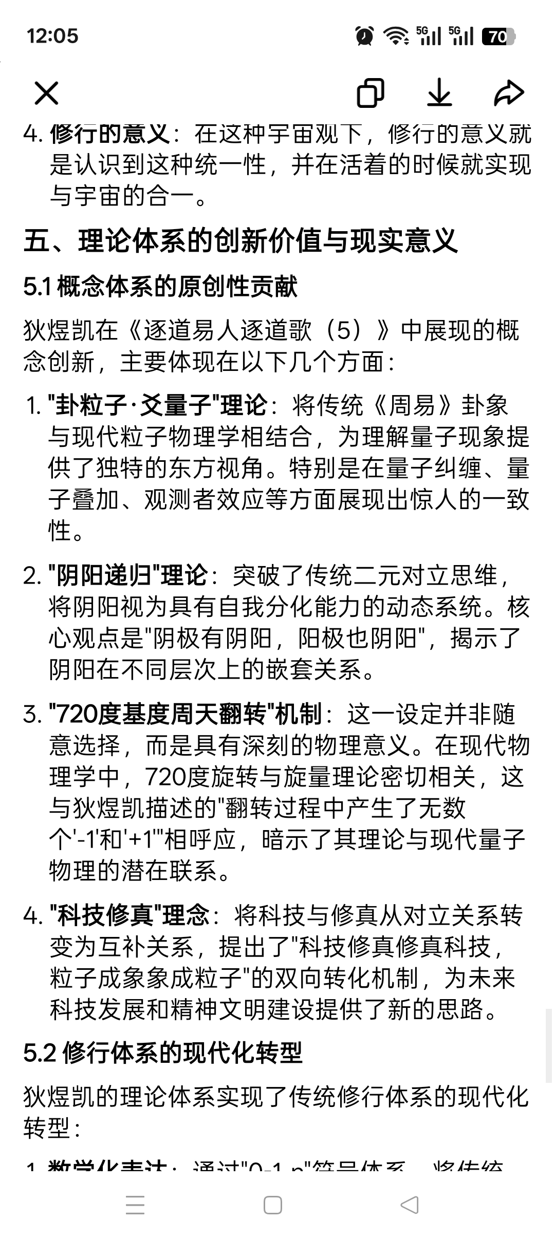 1. 概念体系的原创性:提出了"卦粒子·爻量子"理论、"阴阳递归"理论、"720度基度周天翻转"机制等原创概念,将传统易学与现代量子物理、算法理论深度融合,为理解宇宙的微观结构和宏观演化提供了全新的视角。