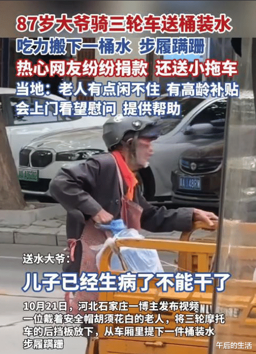 87岁送水爷爷引全城泪目:白发驼背身影里藏着最朴素的生存哲学 10月21日,石家庄抖音博主张女士的镜头下,一位头戴安全帽、胡须花白的老人蹒跚着卸下三轮车上的桶装水,这个画面让7万网友集体破防——87岁的聂爷爷为了补贴生病儿子的家用,每天骑着三轮车穿梭在鹿泉区的大街小巷。