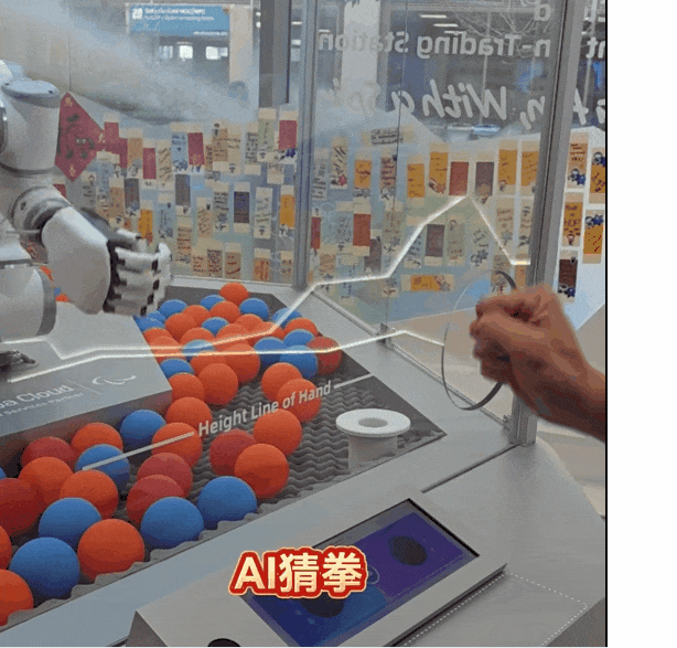站到机器前,和一只「会思考的手」来一局石头剪刀布。灵巧手几乎同步出拳,大模型在极短时间内完成识别、判输赢、出反馈,一气呵成。三局两胜,赢了还有机会解锁装着「稀有款」的红色徽章球。