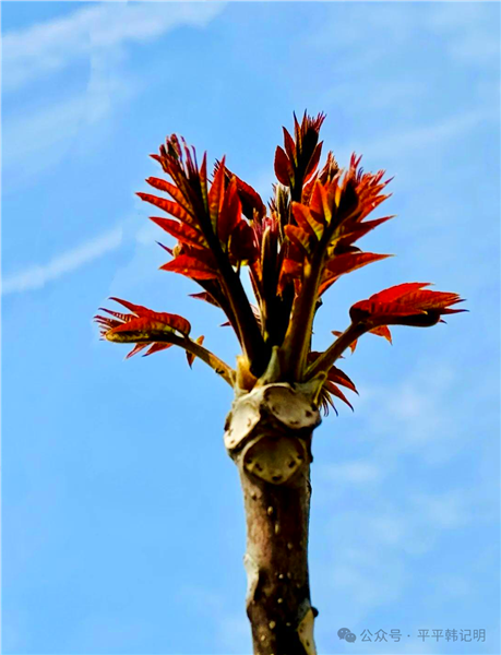 香椿树是一个红脸汉,你看它,初春时节,天气还带着点儿寒意,它就喷薄而出,叶子和嫩茎紫红紫红的,仿佛是憋了一个冬天的情绪,可能是谁招它惹它了,让它如此激动,冲天而生。那叶子、茎,虽然嫩瘦,但浑然一体,裹着一股精气神,让你对它敬之而不可亵玩。叫它“椿”,可能普遍认为它是春天的激进派吧!