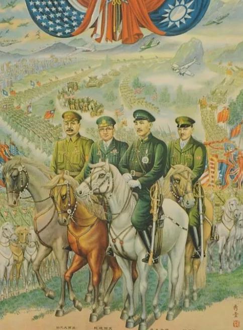 图1:1939年7月10日,蒋介石骑着战马效仿拿破仑,看见远处的日军还是犯怵了 图2:1945年8月波茨坦会议期间的宣传画,蒋介石骑马走中间,杜鲁门在旁边讲解,英国首相艾德礼负责断后,最左边哪位是谁?