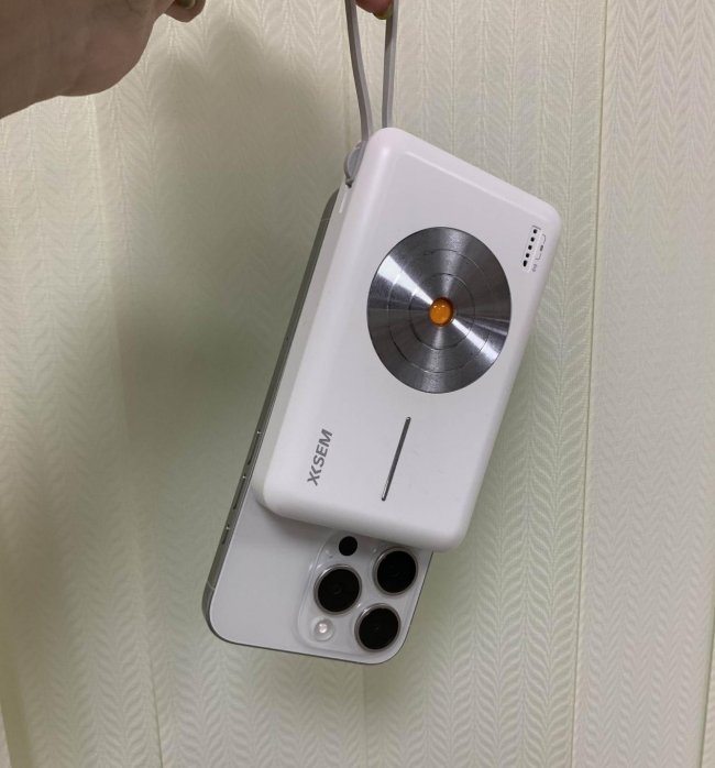 机身大小适中,拿着手感刚好,223g 的重量也不算重,放包里基本没负担。磁吸效果很稳,用的 N52 磁铁,一共 15 颗磁芯,手机一贴就牢牢吸住,不用再缠数据线,边走边充很方便。