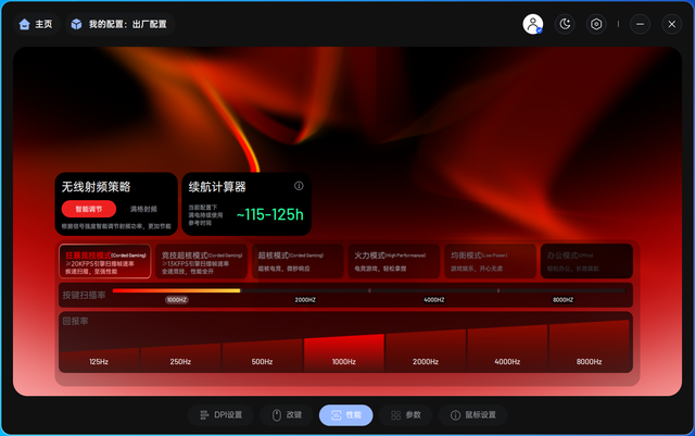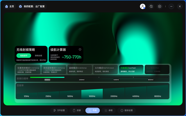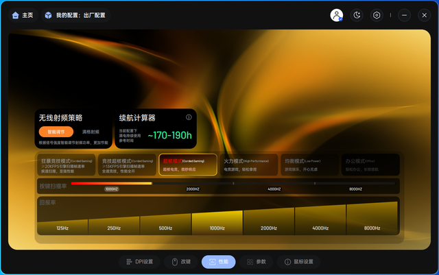 支持强大的改键功能和宏设置功能。我们可以设置多媒体功能和键盘字符功能。参数页面支持调整传感器性能设置、传感器角度调节、按键防抖等功能,为玩家带来了更多进阶调整选项。设置页面支持固件更新、休眠时间设置、低电量提示等功能,设置功能上选项非常丰富。