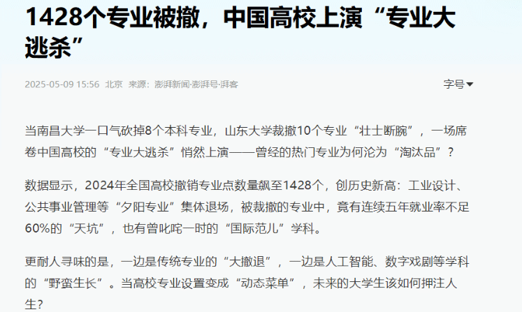根据澎湃新闻记者的分析,2025年被撤销的专业,大致可以分为两类:“夕阳产业”专业和“纸上谈兵”专业。