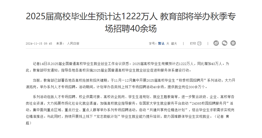 2. 扩招与岗位供给失衡根据智联招聘报道及教育部数据,2025 届高校毕业生规模达 1222 万人,首次突破 1200 万大关,但就业市场岗位质量与数量未同步提升。智联招聘《2024 年 8 月校招人才供需趋势简报》显示,2024 年 1-8 月用人单位招聘需求同比下降 18.9%,毕业生求职热度同比增长 18.3%,求职竞争指数升至 34.0,同比增幅 44.5%。