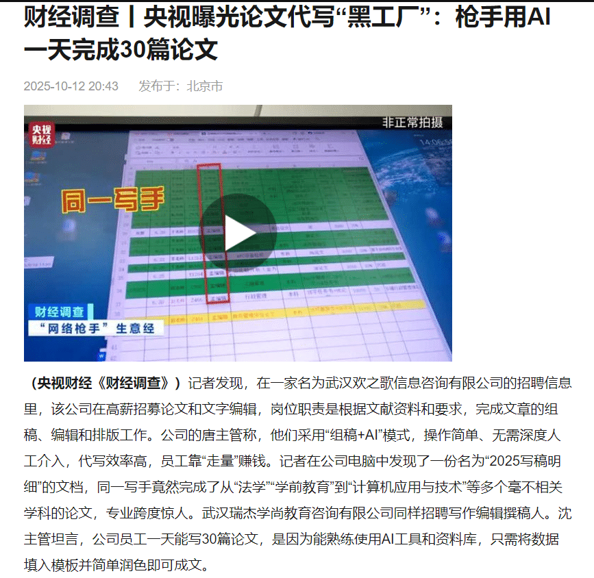 此外,央视财经曝光 论文代写 “黑工厂”,通过 “组稿 + AI” 模式量产论文,年销量超 4 万单,严重破坏学术诚信与教育质量。一旦选择让代写机构操刀论文,就会导致一些学生丧失独立思考和研究能力,答辩时一问三不知。完全在糊弄!