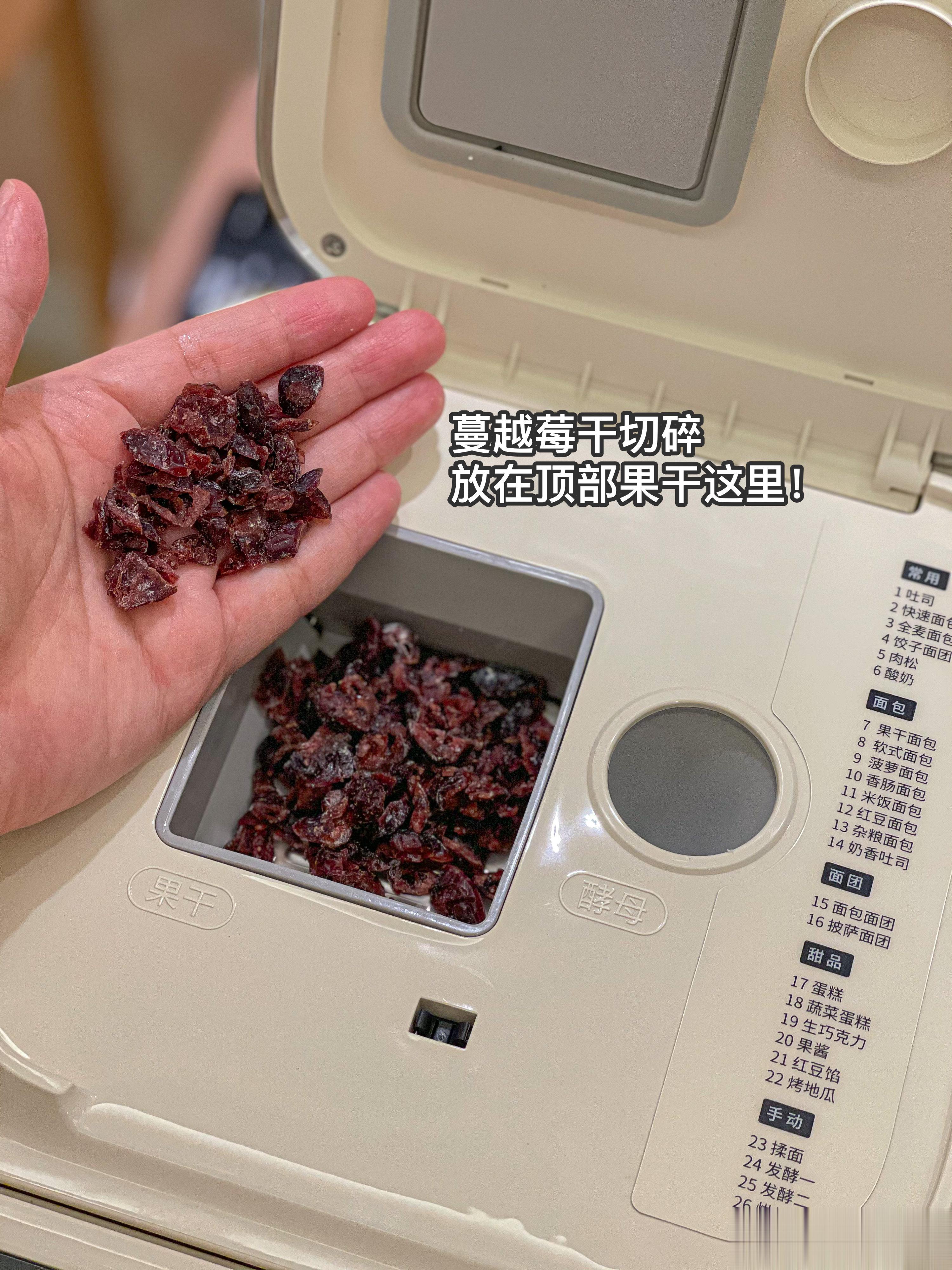1.除蔓越莓,全部放入面包桶里,蔓越莓切碎放在顶部盖子的果干区域。