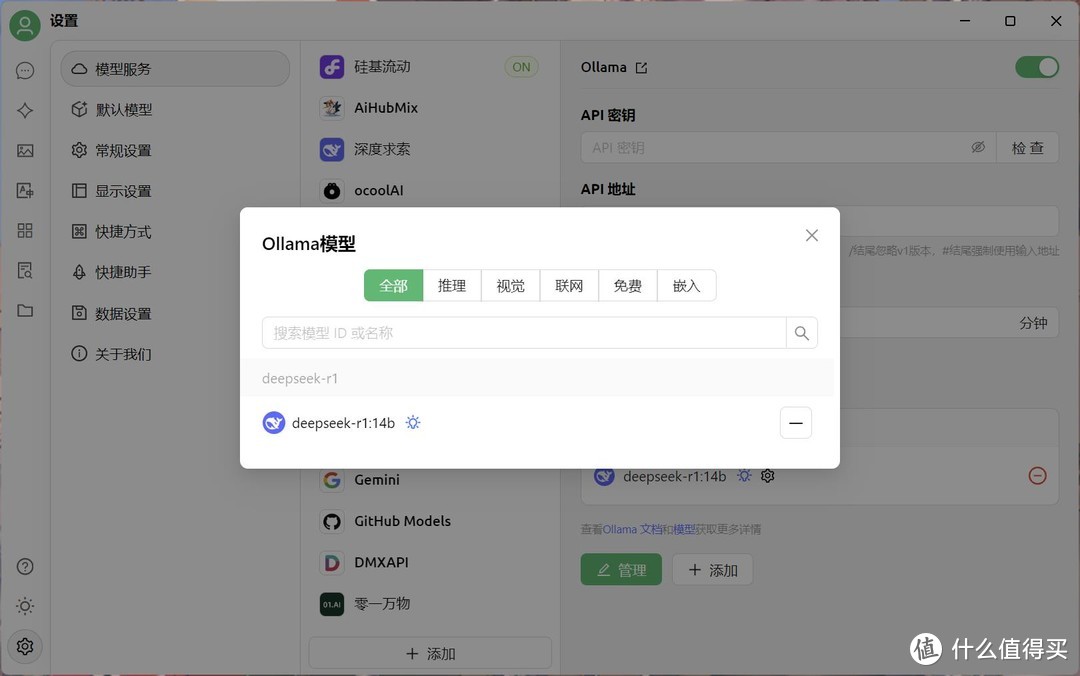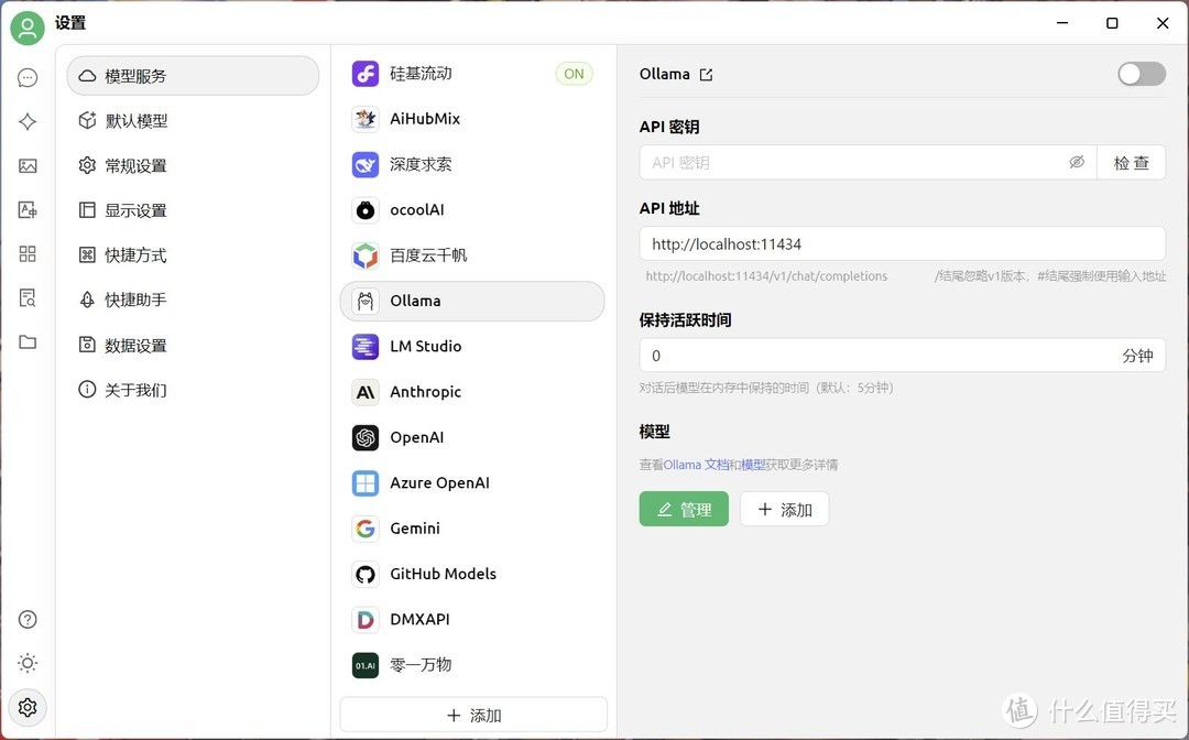 模型服务日选择ollama,开启,其他的大语言模型服务都有可以通过网络了连接实现 。