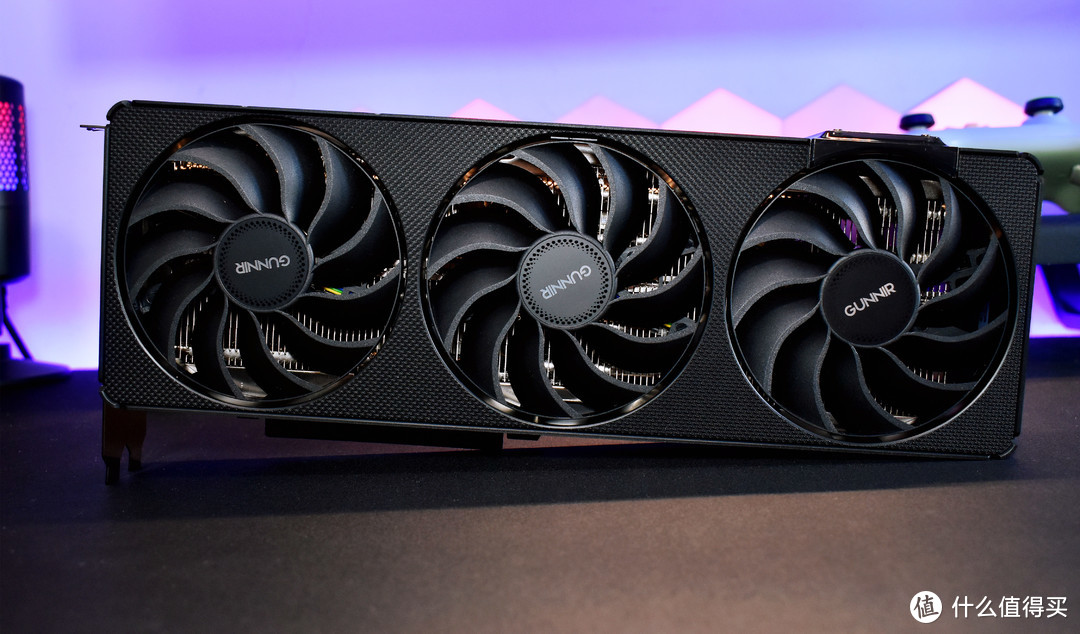 显卡整体延用了蓝戟经典的NEO美学设计,正面交错着网纹线条,给人一种硬朗、刚毅的感觉,含挡片的尺寸为313*130*52 mm,可以满足绝大多数机箱装机。全新的幽刃散热设计, 幽刃环形扇叶,仿波浪曲线造型,对比之前方案,噪音降低 11%,风压提升 26%,确保优异的散热效果,剪辑渲染、跑图跑AI时能有更低的温度和更安静的表现。