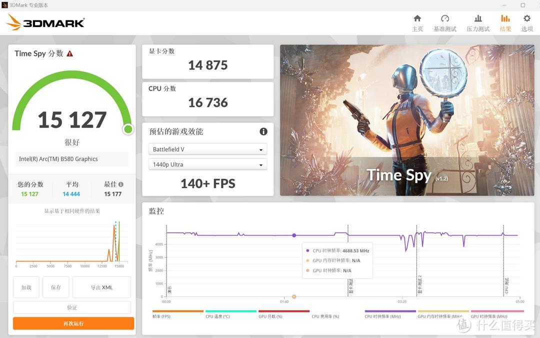 我们来看看显卡的基准性能跑分。Time Spy是针对DirectX 12游戏中2K分辨率下的性能指数。实测下来,默认频率下蓝戟B580 Photon总分15127,其中显卡得分14875,2K画质下市面上3A游戏基本都能畅玩,跑Deepseek自然也不在话下。
