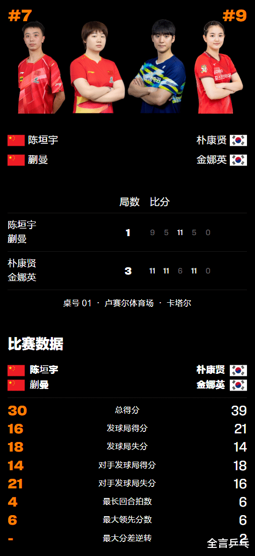混双3对组合也发挥不佳,其中黄友政/陈熠1-3输中国香港的黄镇廷/杜凯琹、陈俊菘/覃予萱1-3输韩国的朴康贤/金娜英,随后陈垣宇/蒯曼也是1-3不敌朴康贤/金娜英,中国队由此而在这两个双打项目中全军覆没,遗憾无缘登顶为王。