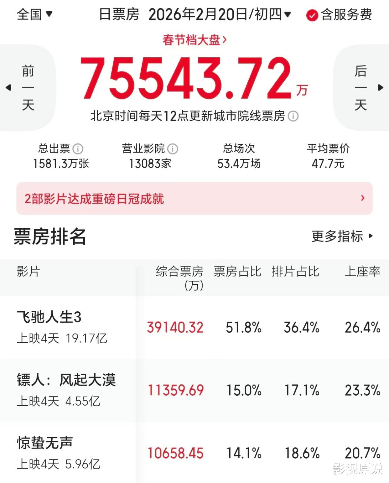 但第二天,《飞驰人生3》的单日票房就缩水了近2亿人民币,之后每日也都在下滑,最终预测票房也因此而缩减了10亿人民币。