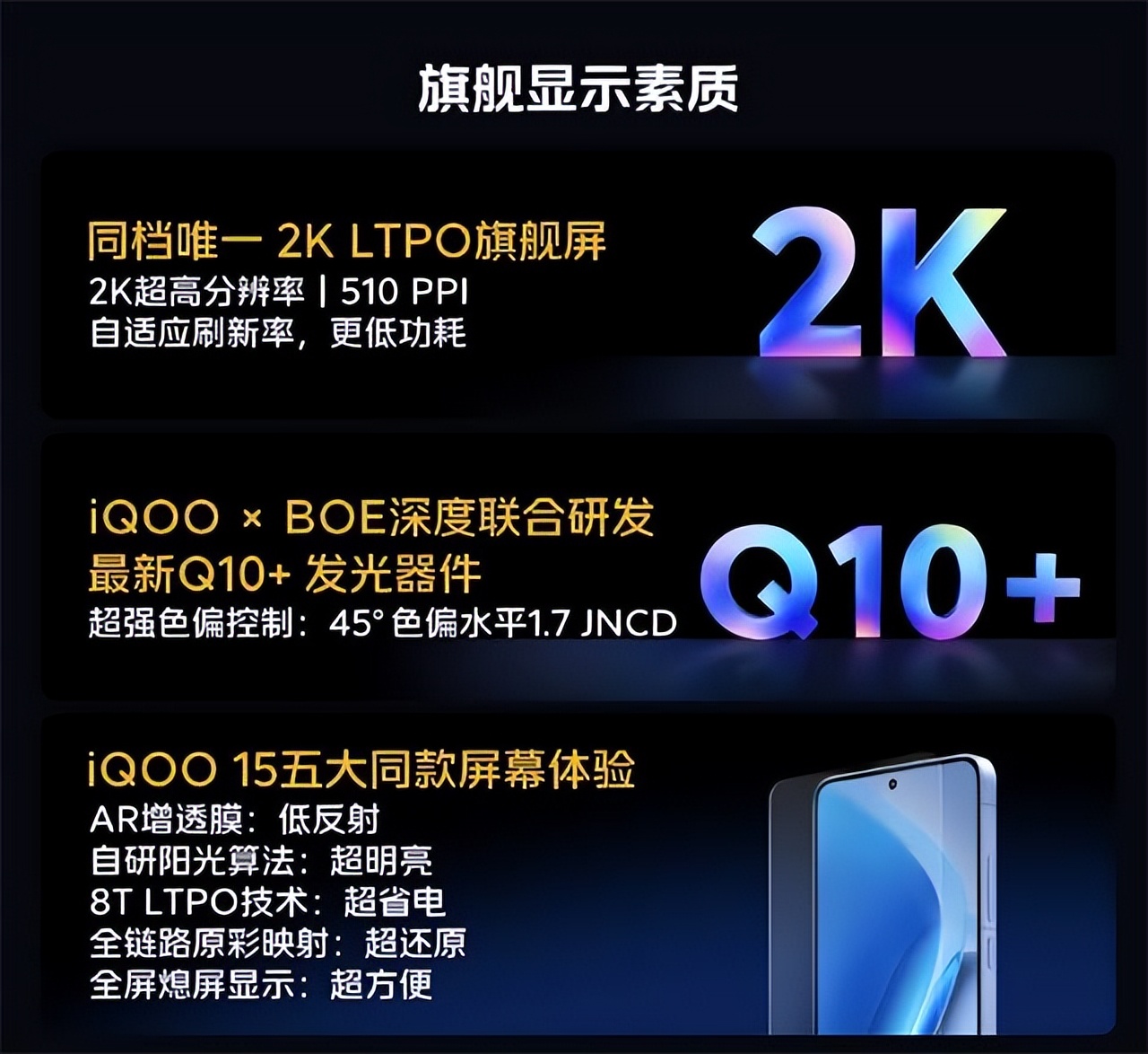 这块2K 144Hz珠峰屏是iQOO Neo11的最大亮点之一。它采用京东方最新Q10+发光材料,分辨率达510 PPI,色偏控制达行业领先的1.7JNCD水平,并支持LTPO自适应刷新技术,兼顾高刷流畅与低功耗表现。护眼方面,全亮度2592Hz高频PWM调光、类DC模式、圆偏振光技术及德国莱茵TÜV全局护眼认证一应俱全。触控体验同样顶级:3200Hz瞬时触控采样率、25.4ms点击延迟、10指300Hz稳定采样,甚至在暴雨、油污等极端场景下也能精准响应。配合AR增透膜、自研阳光算法和超声波3D指纹,日常使用与游戏操控都更加顺手。